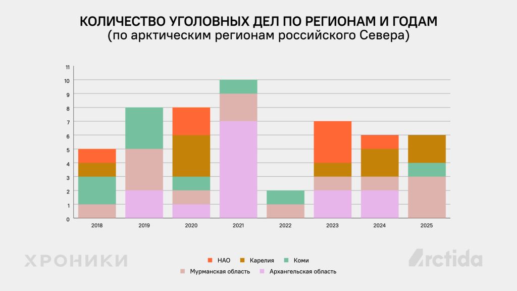 Собранные данные охватывают 49 уголовных дел в 5 регионах европейского Севера России: Архангельская и Мурманская области, республики Карелия и Коми, а также Ненецкий автономный округ. Как видно из данных, в 2022 году наблюдается резкое падение общего количества дел, которое стало снова прирастать с 2023 года.