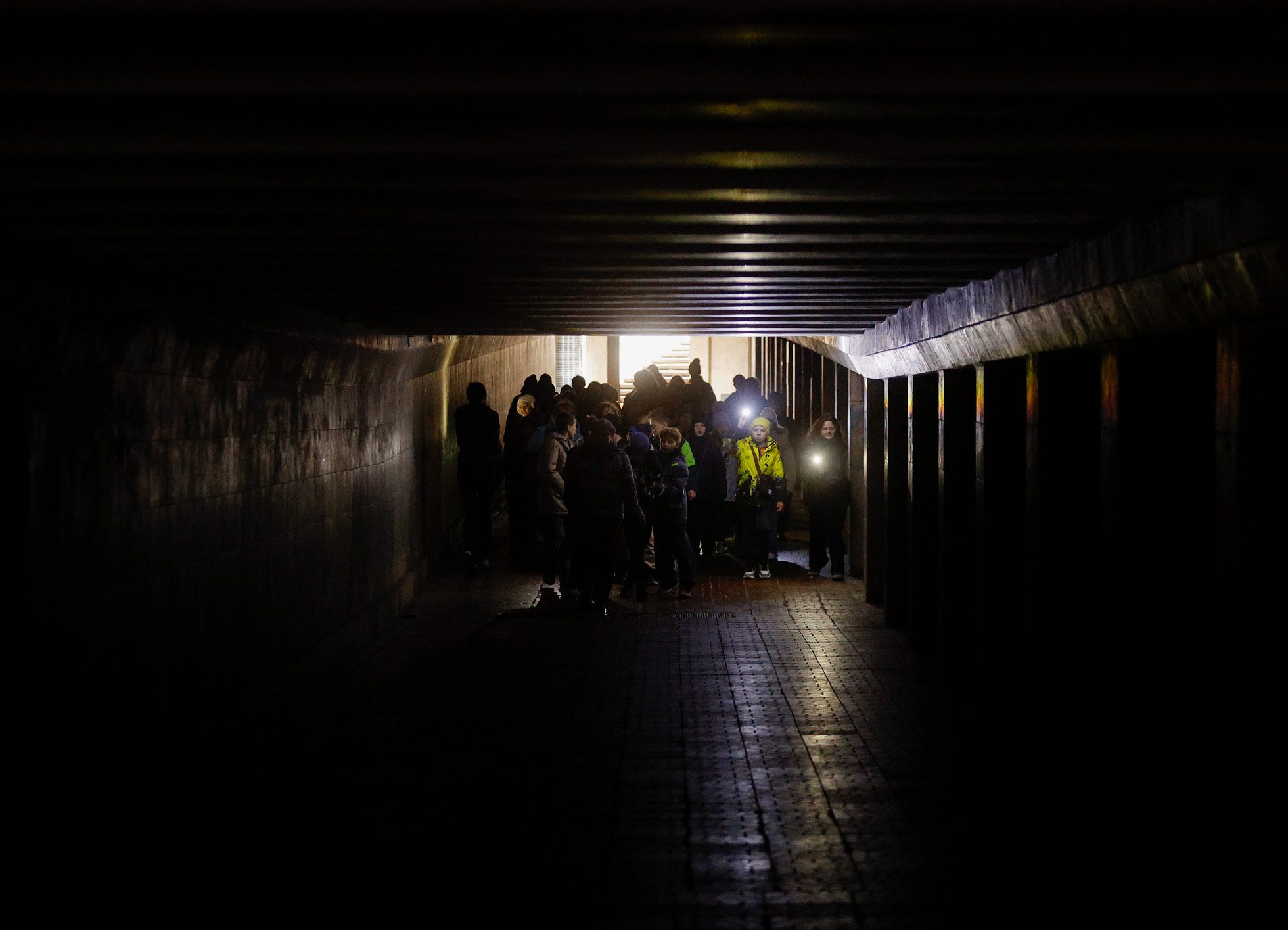 На фото — группа детей с фонариками идет по подземному переходу во время отключения электроэнергии.