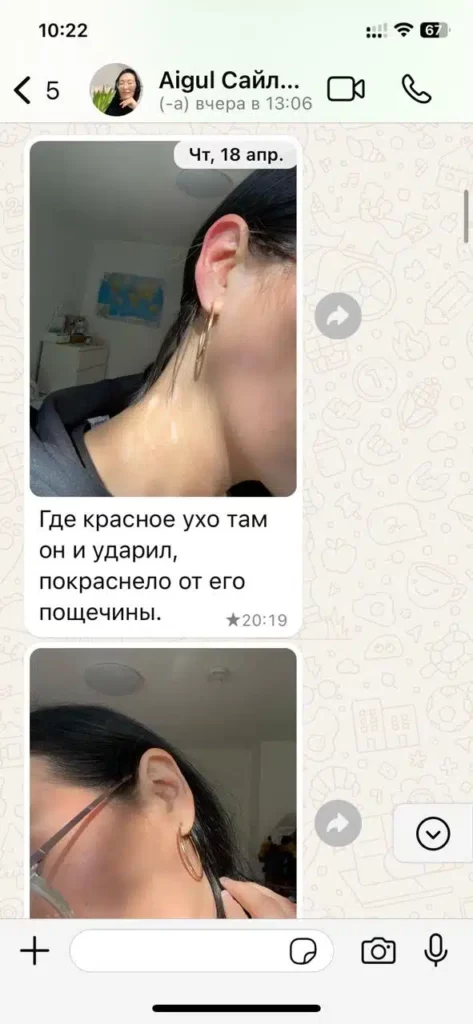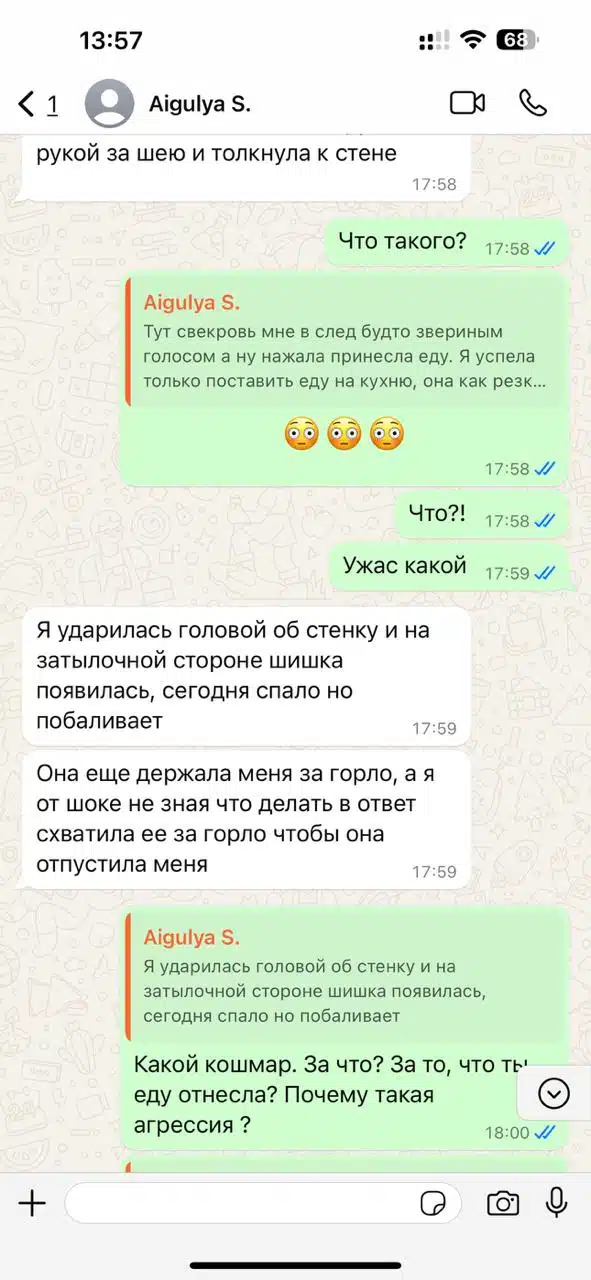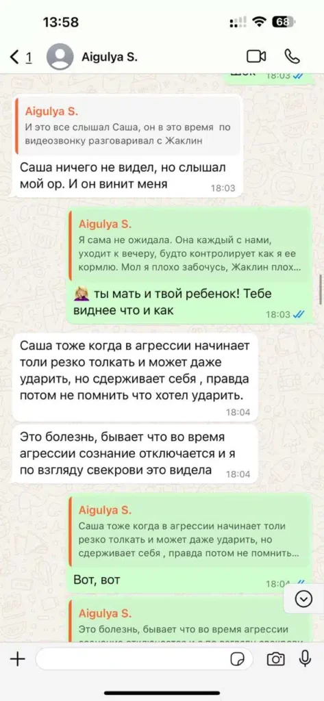 «Это болезнь, бывает во время агрессии сознание отключается. Я по взгляду свекрови это видела», — писала Айгуль про приступы агрессии свекрови в сообщениях подругам. Александр, по ее словам, тоже мог ее толкнуть или ударить, но «сдерживал себя».