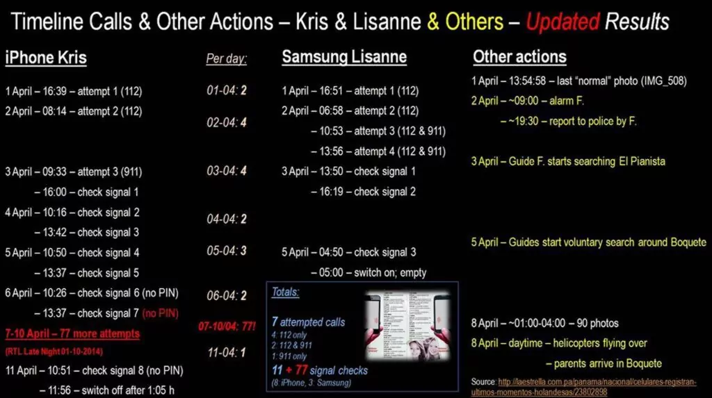 1, 2, 3 и 4 апреля подруги по несколько раз звонили 112 и 911. Потом Samsung Лисанн полностью разрядился. 5 апреля Крис включила свой айфон — но не стала звонить. Возможно, она проверяла сигнал. Позже кто-то включил его еще раз — но на этот раз не стал вводить пин-код (или ввел его неправильно). На следующий день — 6 апреля — ее айфон тоже включали дважды, но не вводили пин-код (это могла делать и сама Крис, чтобы проверить, есть ли сигнал).