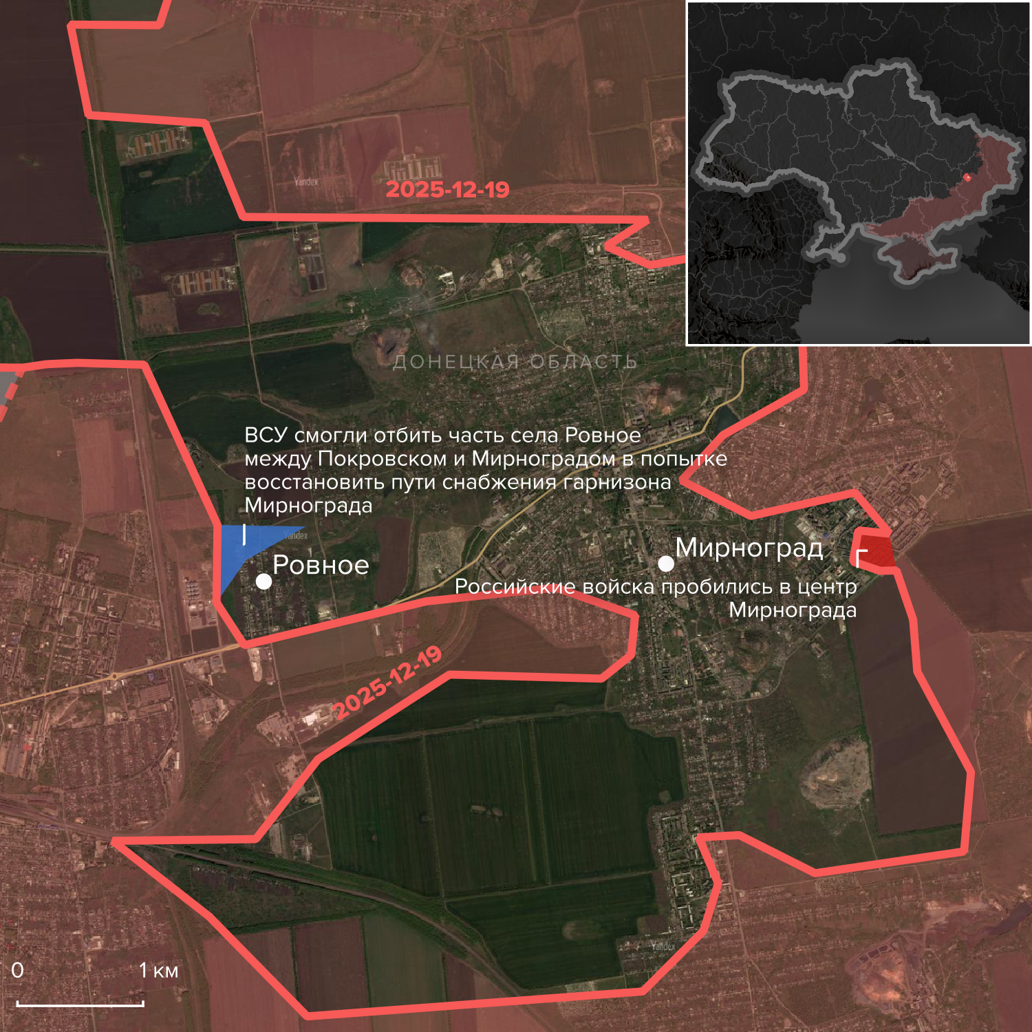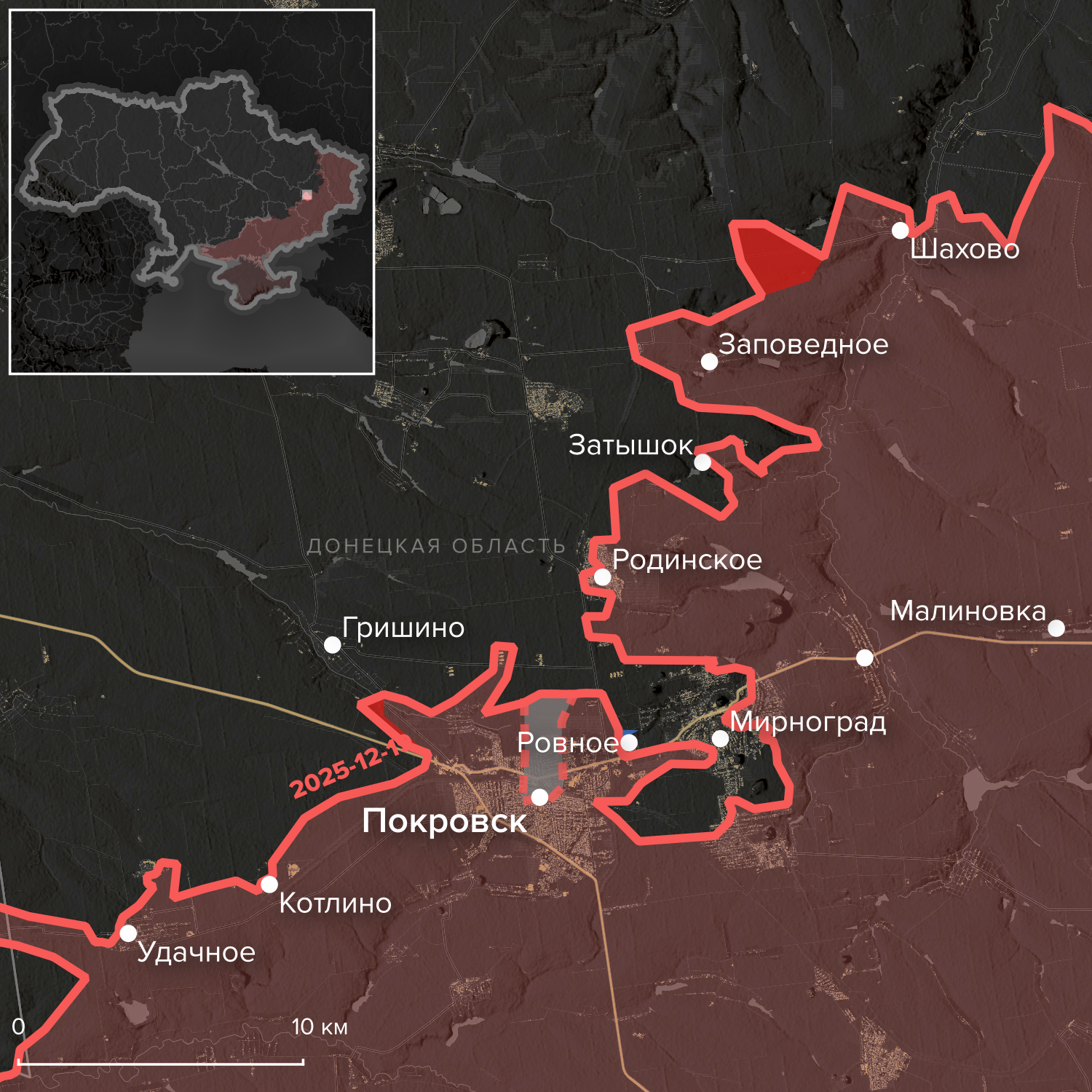 - Ситуация под Покровском остается кризисной для ВСУ. Несмотря на то, что украинские штурмовики просачиваются в город через северные окраины, ВС РФ контролируют почти все районы Покровска. В соседнем Мирнограде остаются значительные украинские силы, которые вынуждены сражаться в фактическом окружении: штурмовики ВС РФ окапываются между Покровском и Родинским, то есть на бывшем пути снабжения гарнизона Мирнограда. Кроме того, идут бои за село Ровное — ранее важный логистический пункт для ВСУ.