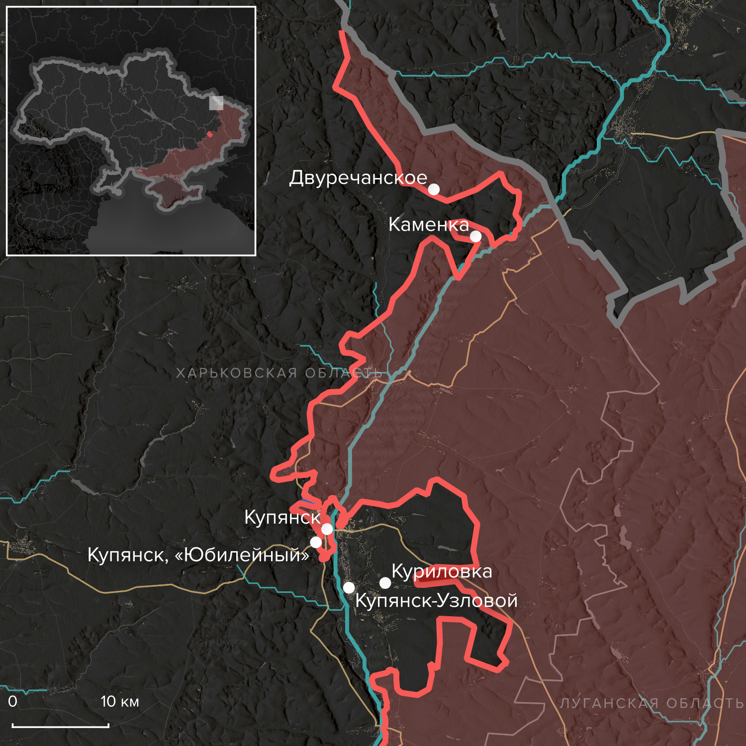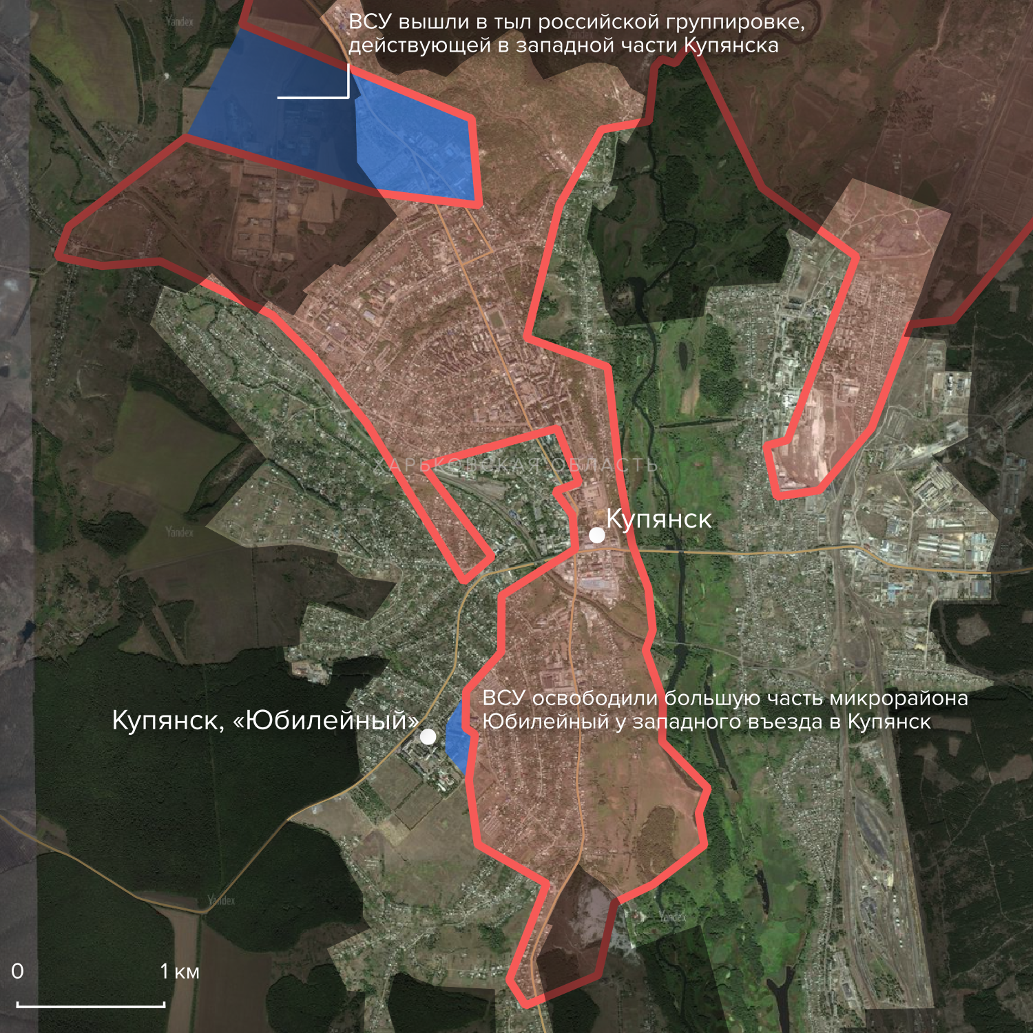 - Российские войска за последний год несколько раз пытались захватить обе части Купянска, разделенного на восточную и западную половины рекой Оскол. Наибольший успех был достигнут при наступлении с плацдарма на западном берегу. ВС РФ прошли через центр и достигли южной окраины. При этом в городе оставались очаги сопротивления ВСУ, в том числе на юго-западной окраине и в центре. Одновременно российские войска смогли занять промышленную зону в восточной половине города.