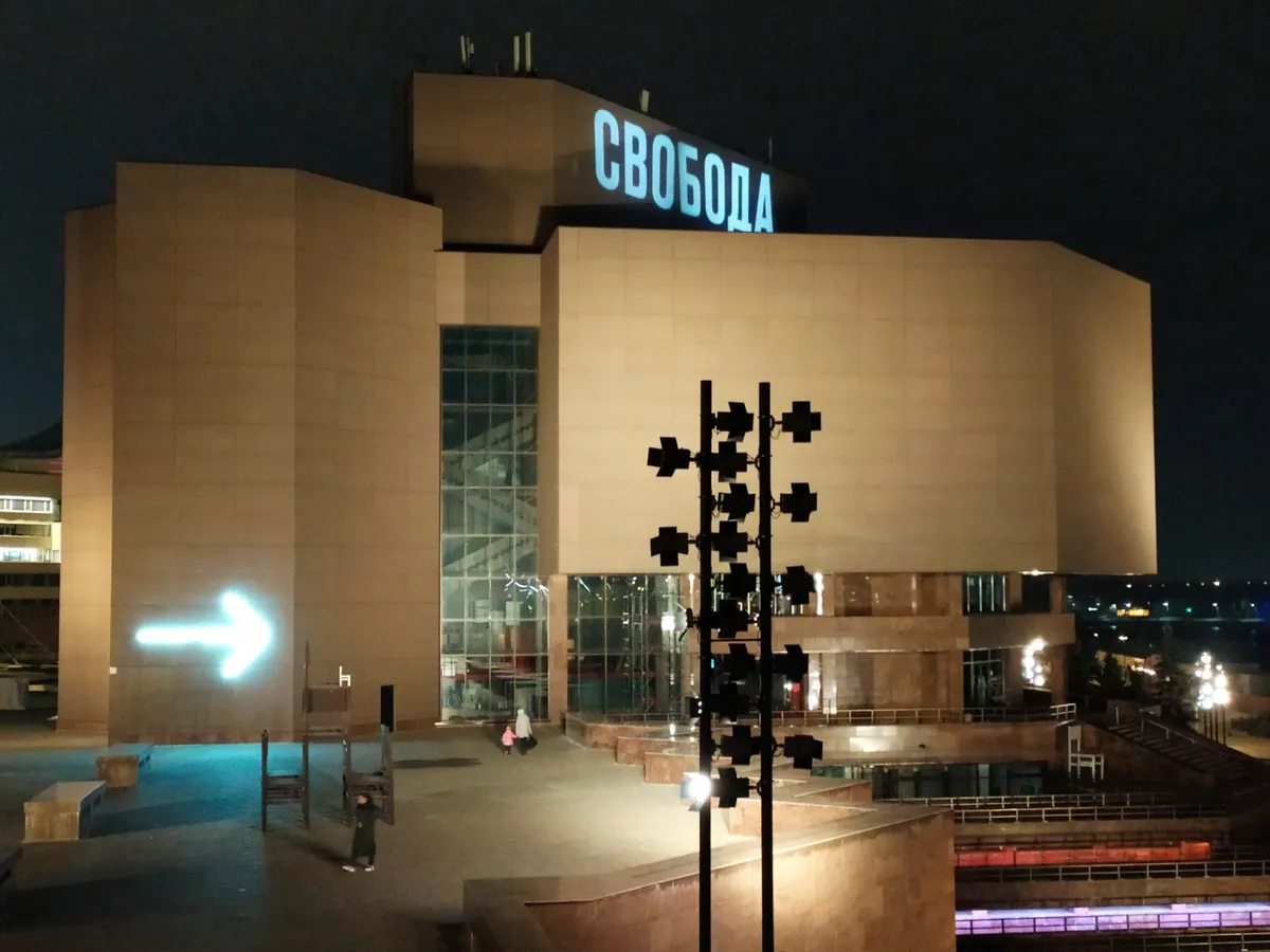 Здесь символических связей и знаков, задуманных нарочно и невольных, увязывающих всю историю последних веков, — выше крыши. И здесь теперь происходит столкновение. Здесь с одной стороны площади Мира по вечерам загоралась Z, она же одно время зажигалась на гигантском экране на фасаде филармонии, а с другой стороны каждый вечер на музейном центре вспыхивает слово СВОБОДА и горит ровным светом уже восьмой год, несмотря ни на что. Нормальное такое соседство. Плывут в воздухе подряд, даже без запятой «Z СВОБОДА».