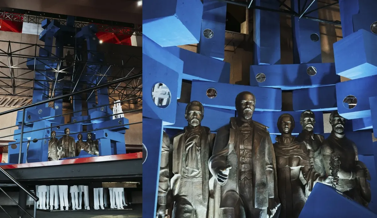 Но теперь к лениниане совершенно иное, чем 50 или 20 лет назад, отношение. А тем более к знамени, вышитому молодыми красноярцами в 1905 году. Знамя вместе с листовками и типографским шрифтом хранились на чердаке дома №9 по улице Марковского, нашли его в 1987-м при сносе, передали в музей. В 2017-м знамя вновь увидело свет, впервые после 111 лет забвения. Входная инсталляция нынешней биеннале, уже 16-й, — «Телепорт» Алексея Шидловского. Многоярусная вавилонская башня, возносящая духов прошлого — бронзовых большевиков — в будущее.