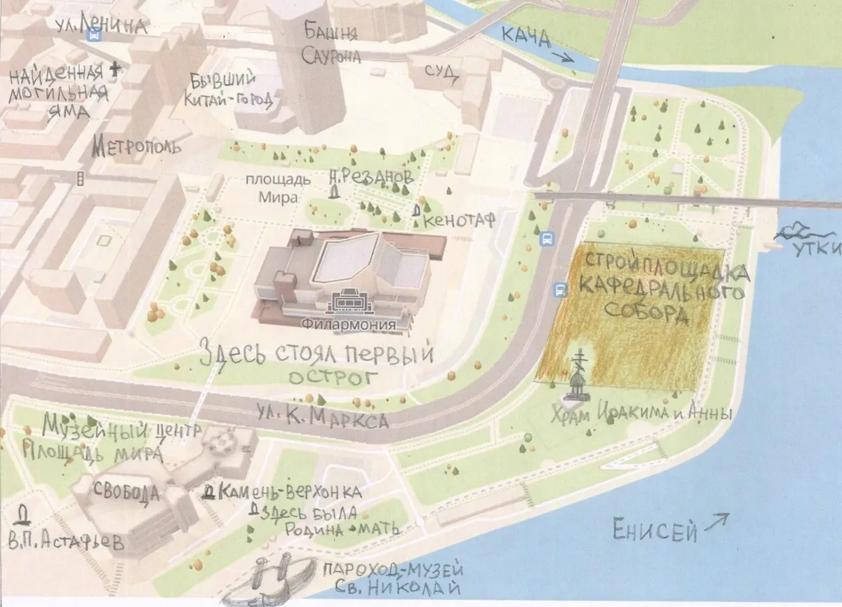 На самой площади Мира, на костях, теперь заливают каток. В этом году открытие будет 14 ноября, обещают «цирковые номера на льду». Помимо того, на Стрелке уже построили одну церковь, небольшую, святых Иоакима и Анны, родителей Богородицы, но это только начало, проба пера — собираются строить новый собор, громадный — Богородице-Рождественский кафедральный. Почти копию прежнего: тот взорвали в 1936-м. Взорвали не на Стрелке, чуть подальше — чтобы очистить место для воздвижения крайкома компартии, ныне это краевая администрация. Сейчас решили не взрывать и не срывать больше ничего, ни краевое правительство, ни филармонию. Патриарх Кирилл заблаговременно, еще в 2012-м, выбрал место рядом с ней. Прямо на низком берегу, там, где люди гуляют по набережной, Енисей периодически поднимается вплотную до выбранного места. В сентябре заложили краеугольный камень. Собор обещают к 400-летию города.