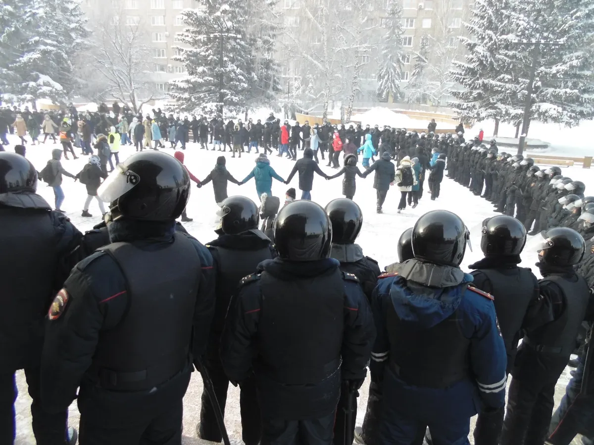 31 января 2021 года фотографии с площади Мира обойдут весь мир. Кто-то снял с верхотуры: плотные ряды черных силовиков, картинно выстроившиеся в каре — только обращенное спецсредствами не вовне, а внутрь, — теснят кучку пестрых молодых людей, в основном девушек. Несоразмерность — из палаты мер и весов, дистиллированная: силовиков больше на порядок. Тогда с очередной протестной акции заберут вообще всех, кто вышел на площадь. И это было действительно кинематографично: смог, минус 35, за ночь подходы ко всем центральным красноярским площадям перегородили снежными валами выше человеческого роста, валы нагребли и на самих площадях. И всюду — цепи из автобусов, набитых силовиками: вокруг площадей, в сквозных дворах. Черные шлемы, дубинки — «космонавты» стояли плотно друг к другу в несколько рядов, закрывая все выходы с площади Мира, и начали сходиться.