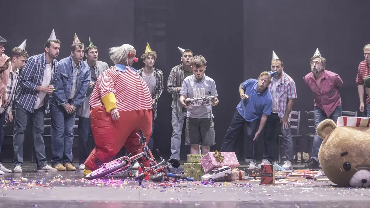 Кстати, о лужах: время от времени с ритуальным бесстрастием — как подлодка включает локаторы — сцена выдавливает на поверхность белоснежную сантехнику. Она типа сканирует рутину происходящего (о, чешская сантехника, ты навеки в наших сердцах!). Герои — на радость зрителям — время от времени употребляют санузел по назначению. В том числе папа мальчика, не отрываясь от телефона. Но назначение самого папы неясно. Вернее, ясно, что он на круглосуточной связи с клиентом. И все! Мальчик за десять лет своей жизни никак не может это себе уяснить и все рвется рассказать папе главу из «Мушкетеров» — но связь папы с клиентом нерушима. Мушкетеры воспринимаются как помехи на линии. И всё. Вот этим «и всё» Крымов подрезает каждую сцену, ибо гротеск зашкаливает, как и жалость к никому не нужному наследнику. Которого родители то путают с котом, то вообще не узнают, подвыпив, а ближе к концу запросто принимают кровищу в его плошке за борщ и несут подсолить.