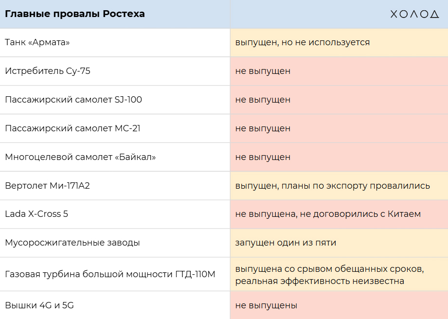 АвтоВАЗ и YotaPhone, Sukhoi Superjet (SSJ-100) и танки «Армата», Су-75 и система сбора денег с дальнобойщиков «Платон», а еще вышки 5G и даже мусоросжигательные заводы — все это так или иначе связано с госкорпорацией «Ростех», империей друга Путина Сергея Чемезова, которую он строит почти 20 лет. За это время сам Чемезов прошел путь от второстепенного директора до чуть ли не главного человека в российской промышленности. Правда, головокружительных успехов в самой промышленности за эти годы так и не зафиксировано, а практически все распиаренные с помпой проекты оказались провалены, что наглядно показало вторжение в Украину. Искусство красиво обещать — в материале «Холода».