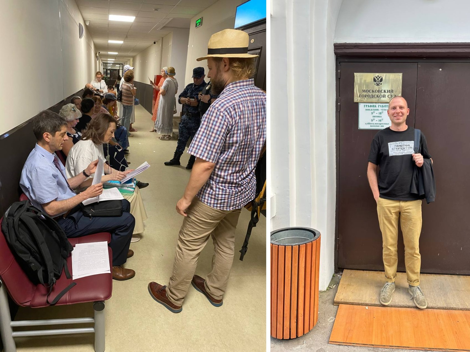 Активисты и активистки Архнадзора во время судебного заседания и Евгений Соседов около здания суда, где проходили слушания © Евгений Соседов