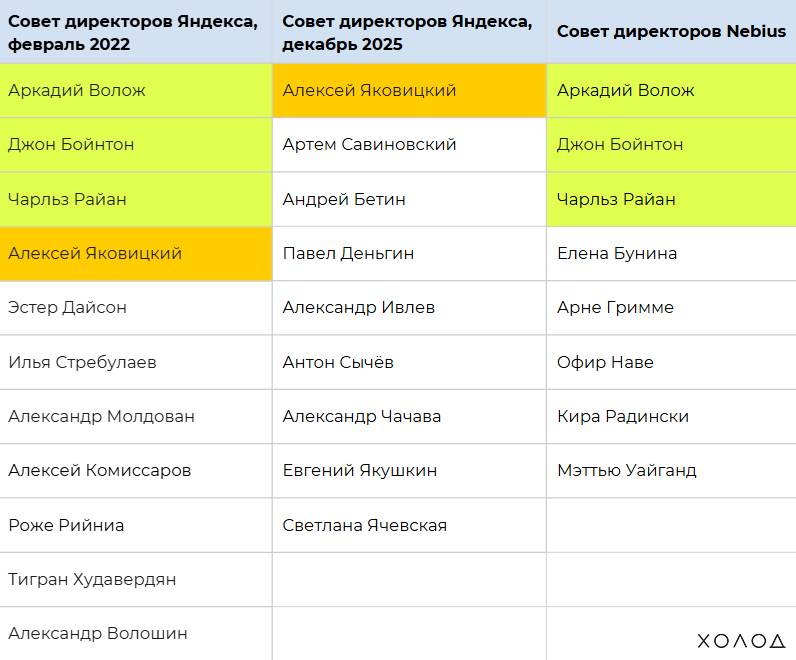 В итоге совет сократился почти вдвое: в нем осталось шесть человек. Спустя два месяца после ухода Комиссарова к совету присоединился Андрей Бетин. А после раскола весь состав российского «Яндекса» пересобрали заново, и из предыдущего состава туда вошли только Бетин и Яковицкий. Двое (Волошин и Молдован) больше не имеют никакого отношения ни к «Яндексу», ни к Nebius, а еще трое (Джон Бойнтон, Роже Рийниа, Чарльз Райан) участвовали в разделе активов и после его завершения присоединились к Воложу.