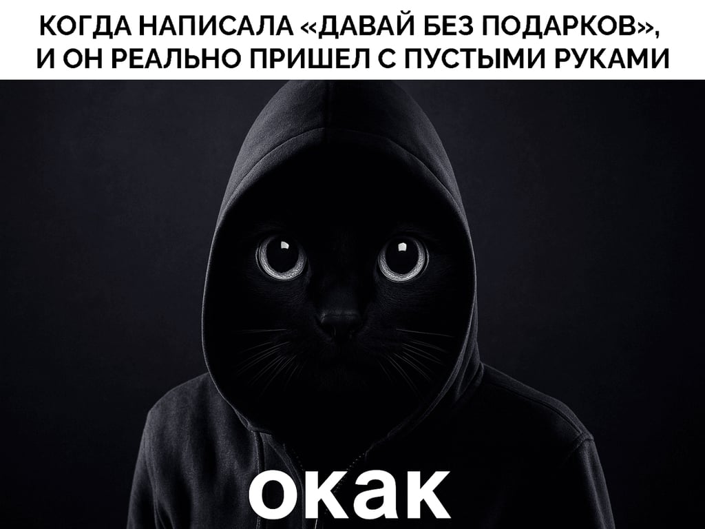 Мем мая — это картинка с черным котом в темном капюшоне, и рядом с ним написана фраза «окак» в одно слово. Это выражение удивления и неожиданного осознания, что-то между простым «Ого» и более сложным осознанием «Так вот как всё происходит на самом деле». Отсутствие пробела в слове «окак» усиливает ощущение абсурда.