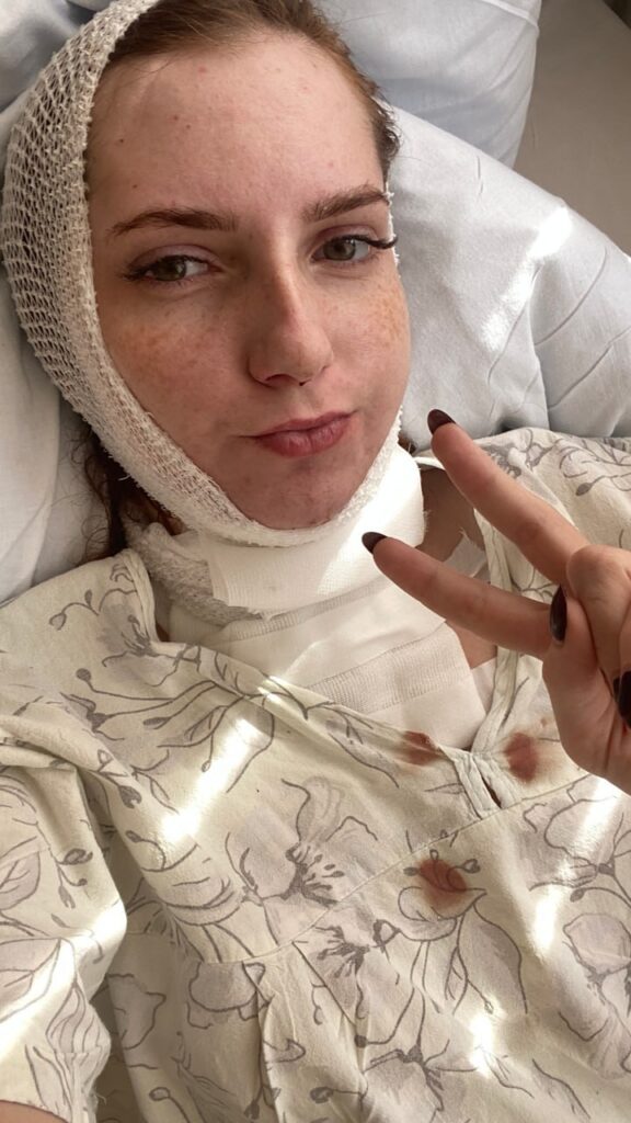 Сначала меня отвезли в одну больницу: там успешно вскрыли абсцесс, но в ней не было отделения челюстно-лицевой хирургии, и меня повезли на скорой в другую клинику. Я настолько не осознавала серьезность происходящего, что написала друзьям, что еду в больницу, где меня просто быстро осмотрят. Я даже взяла с собой ноутбук — думала, что смогу поработать и не буду брать больничный.