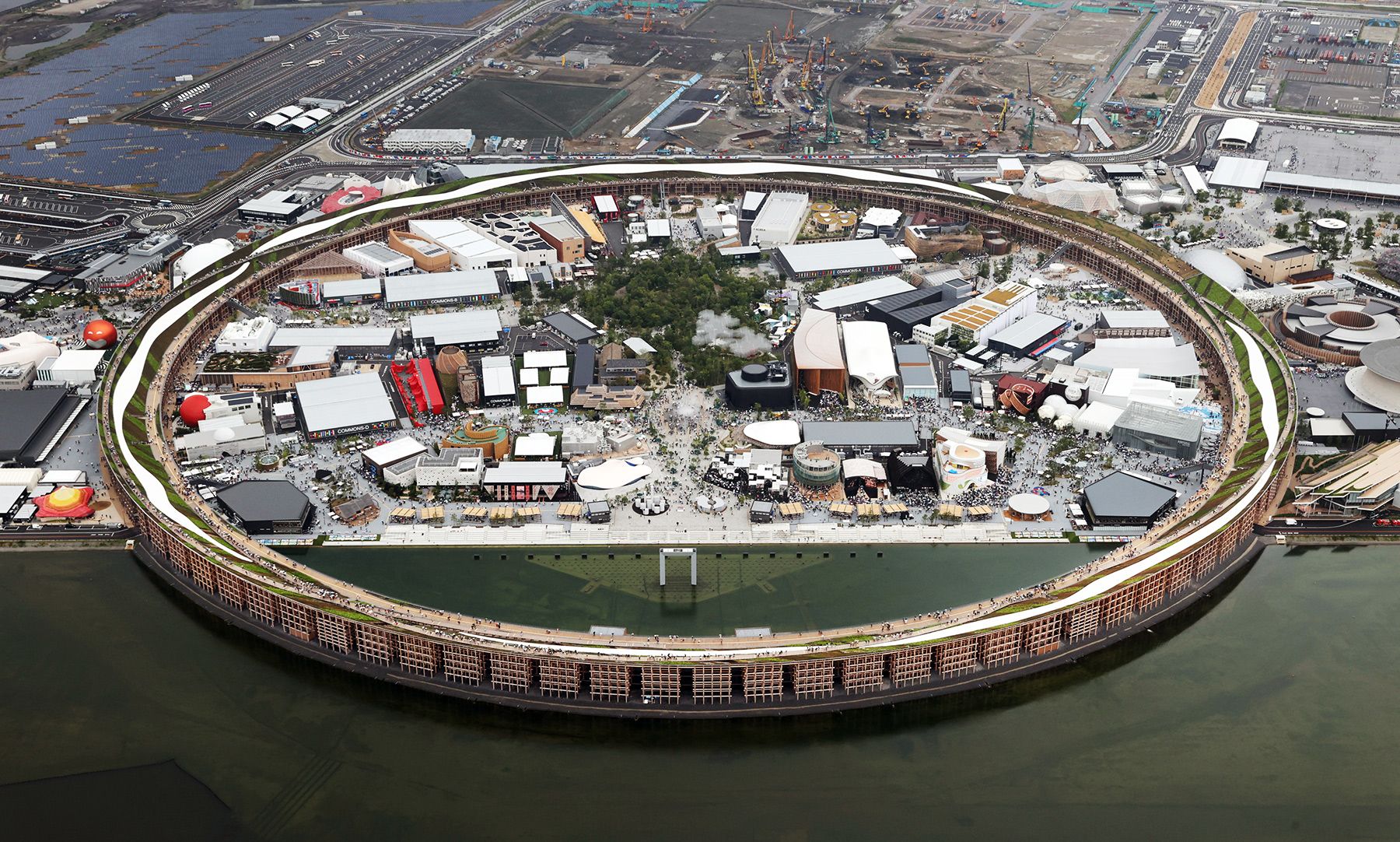 Генплан Экспо разработал Соу Фудзимото, один из самых известных современных архитекторов Японии. По его же проекту построили павильон вокруг всей территории выставки — Большое кольцо (Grand Ring); пока шла Экспо, это здание было крупнейшим деревянным сооружением в мире. Пешеходы передвигались либо под навесом внутри него, либо по озелененной крыше с видом на Осакский залив. Облик Большого кольца вдохновлен архитектурой древних японских храмов. Основные материалы — доски из кедра и местного кипариса хиноки; для сейсмоустойчивости их скрепили металлом.