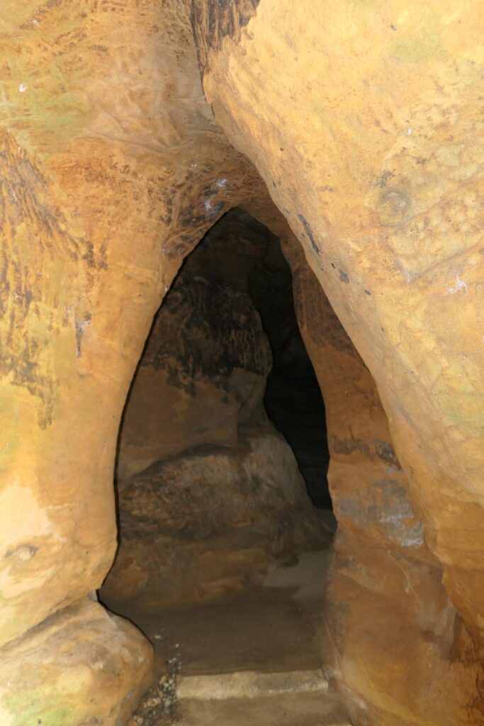 Через каждые несколько метров в стенах выдолблены углубления — вероятно, в них ставили масляные лампы. Есть углубления пошире с грубыми выступами, напоминающими скамейки.