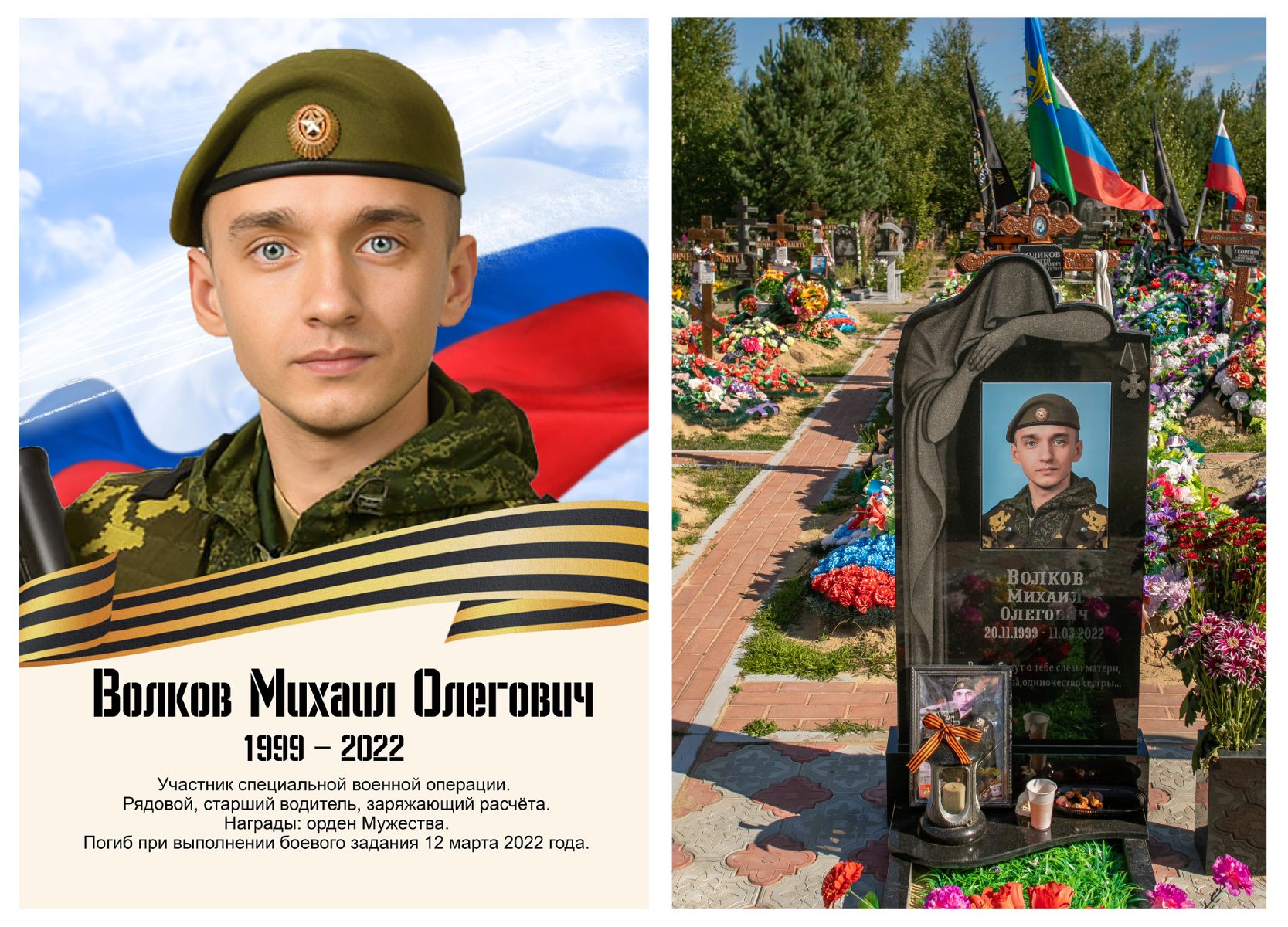 Михаилу Волкову, мать которого выступала на открытии выставки, к началу вторжения в Украину был 21 год. Подробную биографическую справку составляли его родители, и в ней говорится, что юноша был активным членом военно-патриотического объединения «Стрижи», а после окончания Тюменского индустриального университета решил пройти срочную службу в армии — его призвали в декабре 2021 года, он попал в в/ч №91704 в Клинцах приграничной Брянской области.