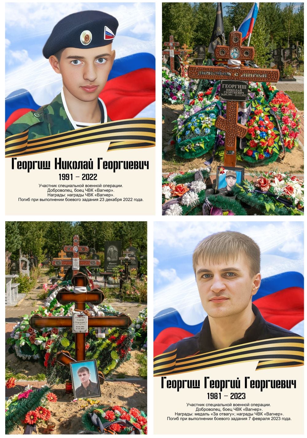 Братья Георгий и Николай Георгиши родились с разницей в 10 лет — в 1981 и 1991 годах. Старший погиб 7 января 2023 года, пережив младшего на две недели. На выставке они предстают как «добровольцы "ЧВК Вагнера"». Однако на войну они попали из тюменской ИК-2, где оказались после приговора по делу о покушении на распространение наркотиков: старшему в 2016 году назначили 12 лет и три месяца, младшему — 11 лет и 11 месяцев.