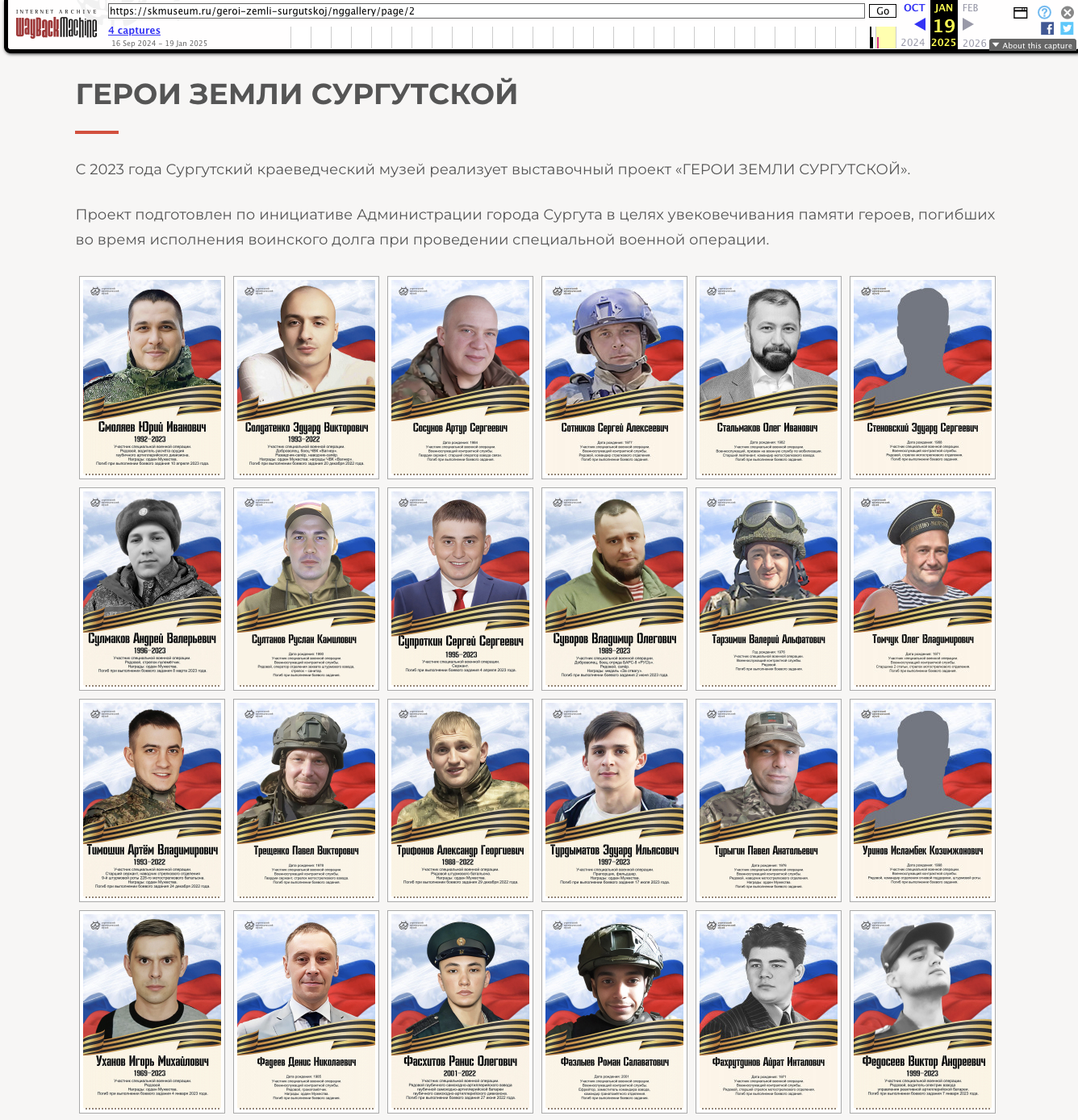Вирутальное собрание постоянно пополнялось, и к январю 2025 года на сайте было выставлено 157 портретов. По данным из поименного списка потерь, 19 из них были заключенными, что, конечно, никак не было отражено на цифровых плакатах. Однако с начала 2025 года плакаты исчезли, и вместо них появилась надпись «Страница в доработке».