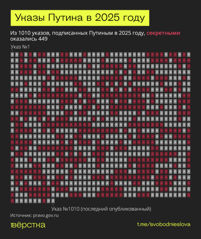 За 2025 год Владимир Путин подписал как минимум 1010 президентских указов, из которых 449 не были опубликованы. Таким образом, доля засекреченных документов за прошедший год достигла 44,5%, подсчитала «Вёрстка» на основе портала официального опубликования правовых актов.