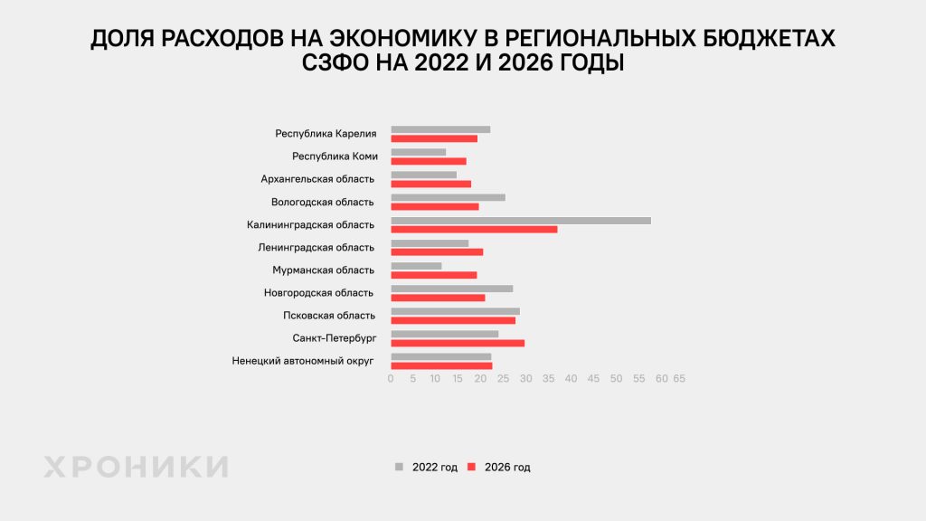Для исследования «Хроники.Медиа» сравнили, как в утвержденных бюджетах региональные чиновники северо-запада России видели развитие своих регионов в 2022 (бюджеты были приняты за 2-3 месяца до начала войны) и 2025 годах и как планируют 2026 год.