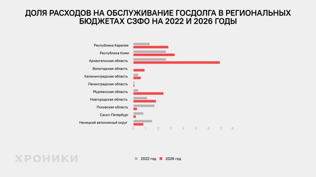 После расходов на мобилизационную подготовку («национальную оборону») расходы на обслуживание госдолга в региональных бюджетах показали самый стремительный рост. Только Псковская область, Ненецкий автономный округ и Санкт-Петербург из регионов СЗФО продемонстрировали снижение доли этих расходов. Но в Вологодской области доля расходов на обслуживание долгов с 2022 года увеличилась в 54 раза (с 0,02 до 0,9%), в Мурманской области — в 6,5 раз (0,4 и 2,4%), а в Архангельской области — в 2,6 раза (с 2,6 до 6,9% — самый высокий показатель на Северо-Западе России). Минимальную долю расходов на обслуживание долгов — 0,1% — предусмотрела в бюджете на 2026 год Ленинградская область, где этот показатель остался неизменным с 2022 года.