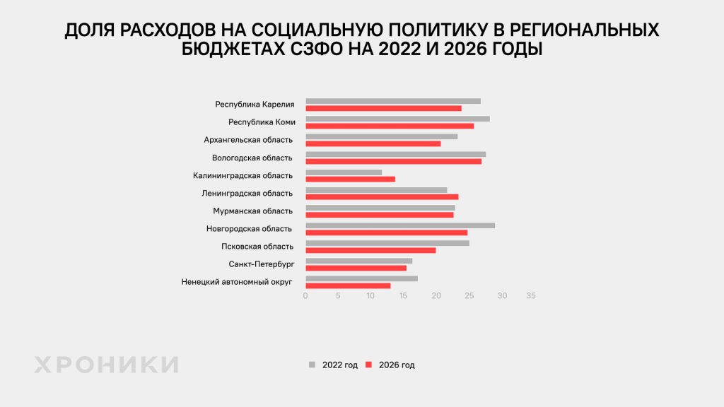 В соответствии с Конституцией Россия — социальное государство. Но девять из одиннадцати регионов СЗФО за четыре года войны сократили эти расходы. Самое значительное сокращение — в Псковской области, с 25% в утвержденном бюджете на 2022 года до 19,9% в бюджете на 2026 год. Только Калининградская и Ленинградская области незначительно увеличили долю социальных расходов.