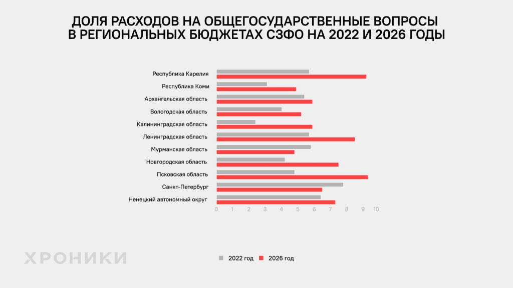 Больше всего за 2022-2026 годы в десяти регионах СЗФО (без Санкт-Петербурга) выросла доля расходов на обслуживание государственного долга. Если в 2022 году на эти цели планировали потратить лишь 1% совокупных бюджетных расходов, то к 2026 году доля расходов на обслуживание госдолга выросла вдвое. Также нарастили расходы на общегосударственные вопросы (содержание чиновников — от зарплат до ремонта кабинетов и закупки бумаги). Доля таких расходов на 2026 год запланирована на уровне 6,7%, хотя на 2022 год планировали потратить лишь 4,6% от совокупных бюджетных расходов.