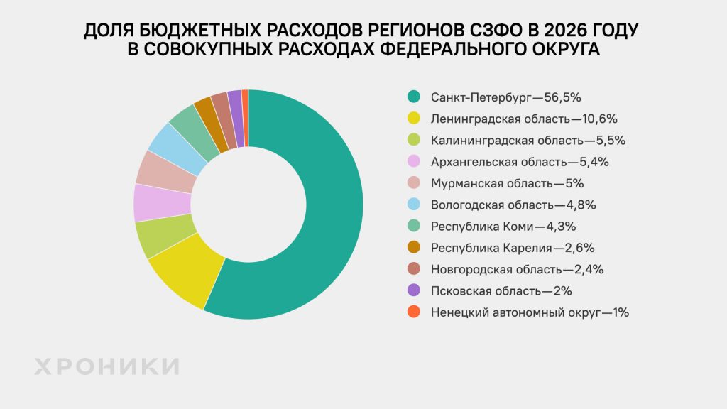 Согласно утвержденным документам на 2026 год, около 56% доходов и расходов всех региональных бюджетов СЗФО приходятся на Санкт-Петербург. В бюджетах на 2022 год, которые были приняты до начала полномасштабного вторжения в Украину, на Петербург приходилось лишь 50% всех доходов и расходов региональных бюджетов СЗФО. В относительном выражении Северо-Запад стал ещё более «петербургоцентричным»: доля Петербурга выросла с 50% до 56%. Это означает, что остальные регионы в сумме растут заметно медленнее. При этом в Петербурге проживает около 40% всего населения СЗФО.