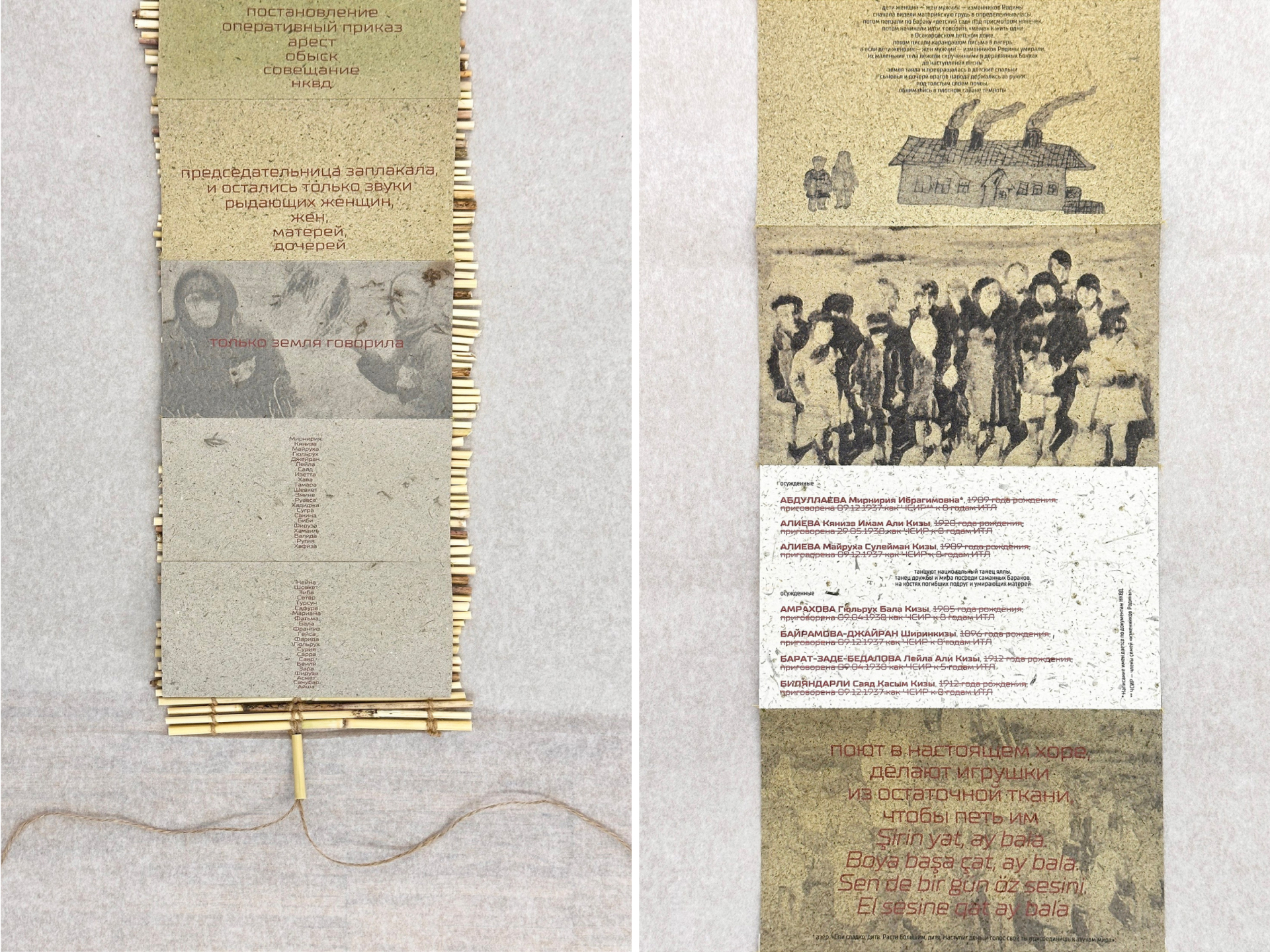 Вместе с художником Анастасией Богомоловой мы делали проект «А.Л.Ж.И.Р.». Это книга, которую Анастасия сделала сама, в том числе бумагу для нее и все другие материалы. Я писала для нее поэтический текст, для чего работала с архивом Акмолинского лагеря жен изменников Родины. Когда я лазила по сайту, меня поразило, что заключенные разделены по национальным группам. Например, можно зайти на вкладку «Азербайджанки». У кого-то данные в картах были заполнены очень тщательно: не только фамилия, имя, отчество, но и где училась, работала. А у кого-то рассказ очень короткий, из разряда «жена такого-то». Видимо, все зависело от конкретного НКВДшника или человека, который вел записи. Меня тогда абсолютно поразило то, как много имен были стерты.