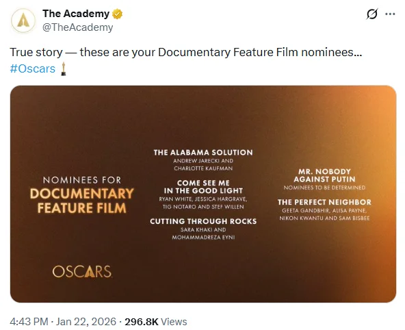В шорт-лист «Оскара» попали фильм о российских журналистах «Мои нежелательные друзья. Часть I: Последний воздух в Москве» и лента «Экстремистка» о художнице Саше Скочиленко*. Номинацию эти ленты не получили.
