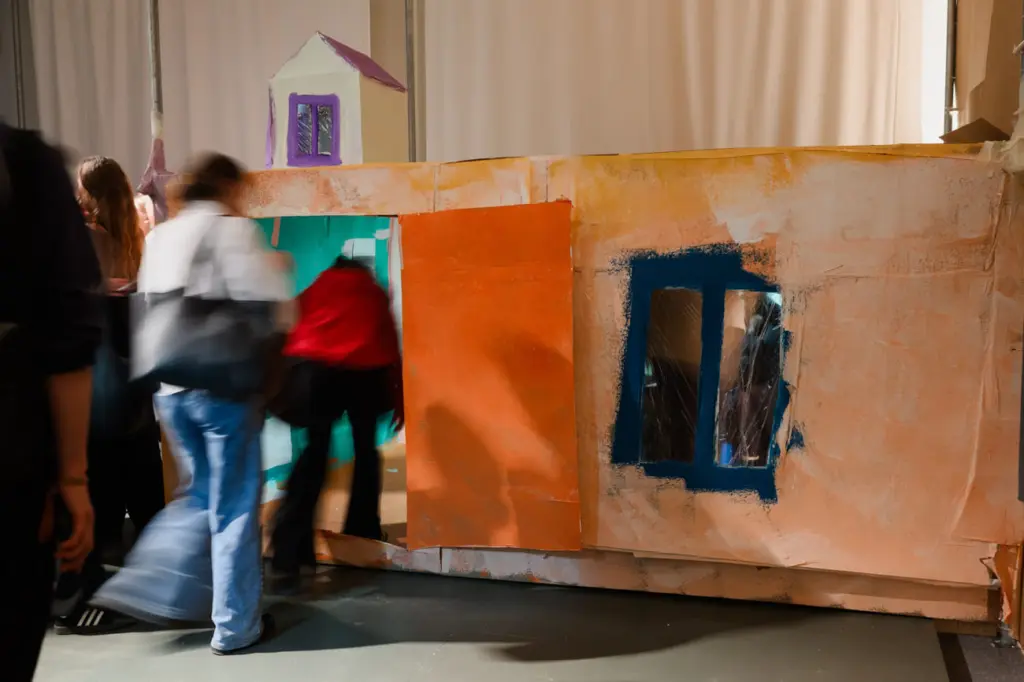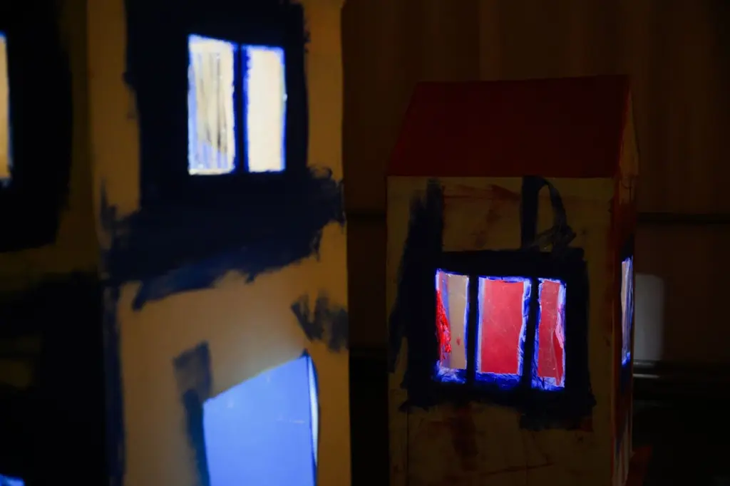 В итоге Алексей создал в пространстве «Тут» в Пермской арт-резиденции огромную тотальную инсталляцию. Большинство его картонных домиков не сильно отличались от тех, что он возводил в интернате, кроме одного: Сахнов склеил из картона двухметровую лагерную вышку.