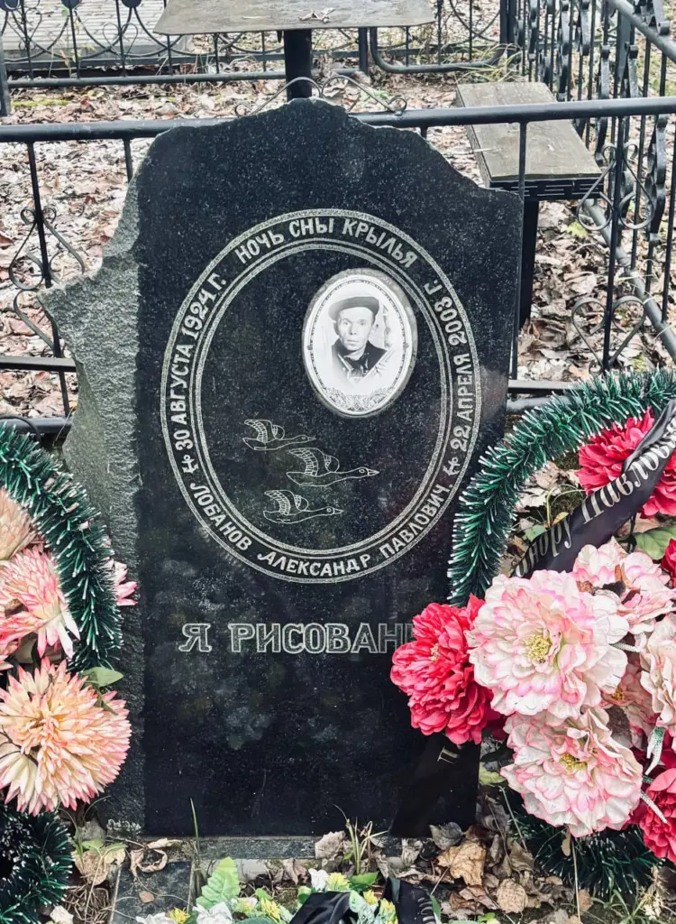 Встретившись с Гавриловым в Ярославле, мы посетили могилу художника. Александр похоронен среди почётных граждан, недалеко от входа, но могила неприметная, и сам я бы её не нашёл. На небольшом тёмно-сером камне выгравирована цитата из рисунков Лобанова «Ночь сны крылья» и одна из его фраз: «Я рисованье».