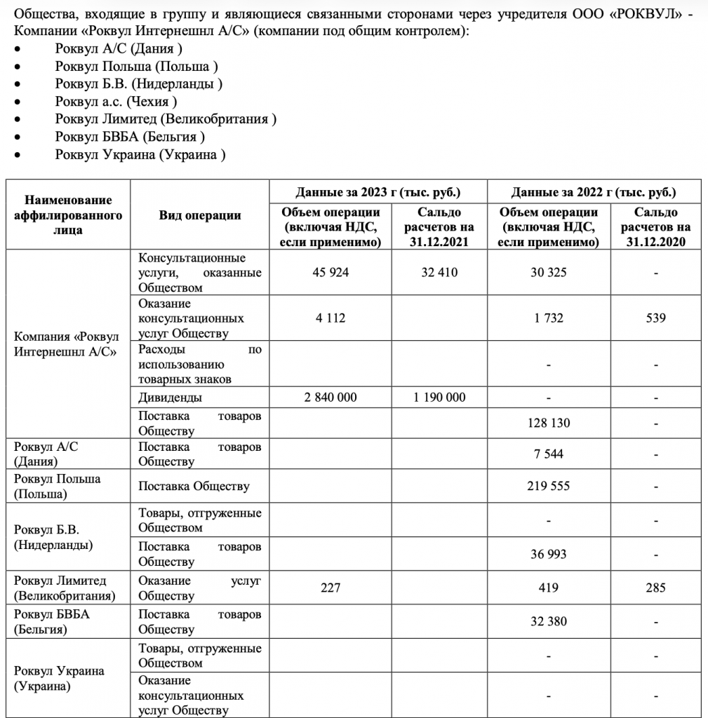 Bilateral transactions between all four Russian companies were mainly linked to the main founder, the Danish Rockwool International (Danish registry number 54879415), but there were also transactions with other companies in the group from the European Union and the United Kingdom. The transactions mainly consisted of mutual consulting services, which are reflected in the financial statements of Russian companies, as well as the supply of goods to and from Russian companies.