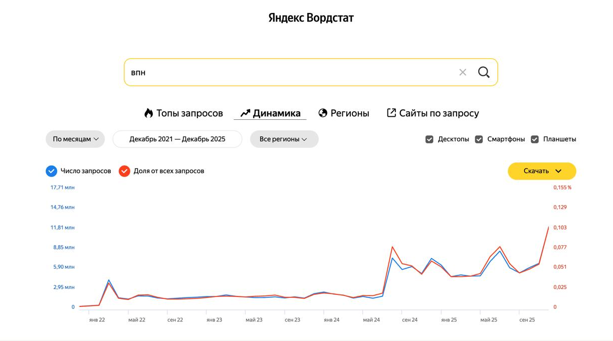 О том, как много людей в России на самом деле пользуются средствами обхода блокировок и маскировки трафика, данных мало. На конец 2025 года в России было около 55 млн человек, так или иначе соприкоснувшихся с VPN, считает техноэксперт Михаил Климарев (признан иноагентом, а также включен в перечень экстремистов). Уровень проникновения технологии он считает по формуле, учитывающей динамику запросов о VPN в поисковике «Яндекса», и сверяет с подсчетами Mediascope об использовании таких сервисов, к которым имеет доступ.