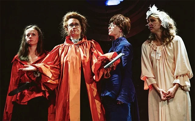 Дамочки множатся, отражаются друг в друге, являя для Чичикова и его племянника опустевший неустойчивый хтонический мир, где кроме прошлого ничего и нет. И вместо будущего — этот траурный холмик. Поэтому дочь-подросток Плюшкиной (Полина Цыганова), в отличие от классической Марьи Антоновны, не о замужестве мечтает, а вырваться отсюда любой ценой. Актеры, как и во всех спектаклях «Озера», не боятся острого пластического рисунка, импровизации, колких диалогов со зрителем.