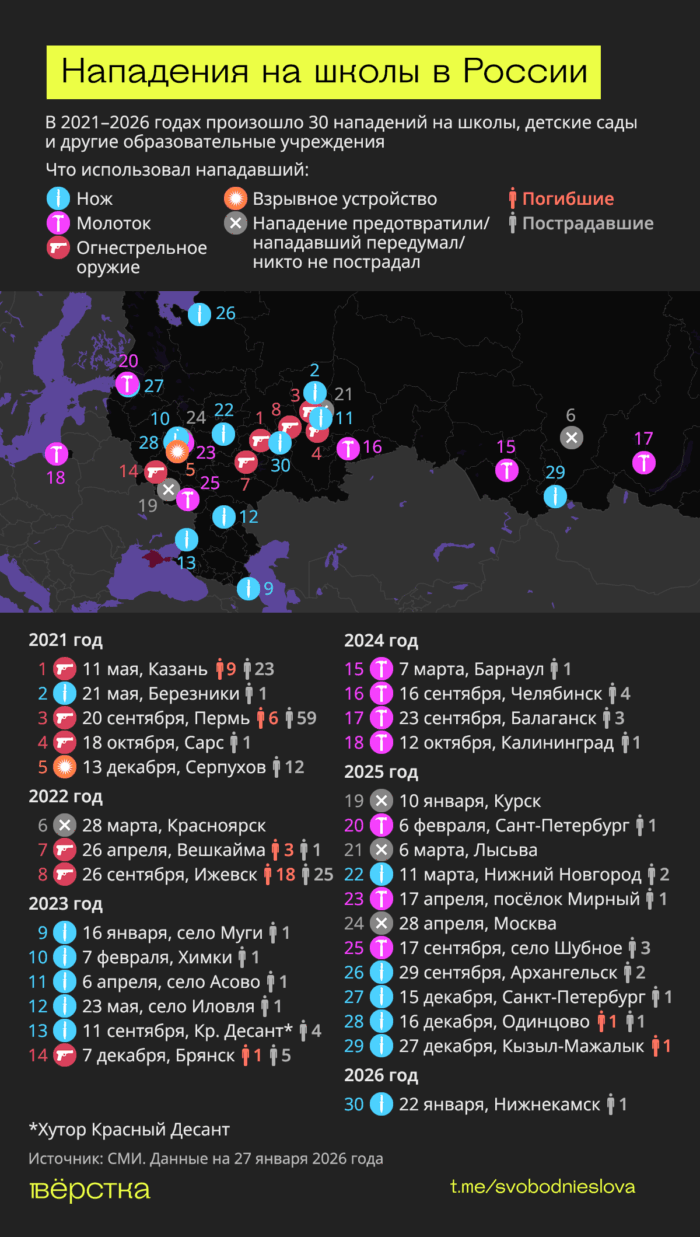 Самым массовым по количеству жертв стала стрельба в школе Ижевска в сентябре 2022 года со стороны бывшего ученика — 34-летнего Артем Казанцева. В тот день погибли 18 человек. Последний случай произошел в 2026 году, когда 13-летний ученик напал на Нижнекамский многопрофильный лицей № 37. Он взорвал петарды и ранил уборщицу ножом, его задержали.
