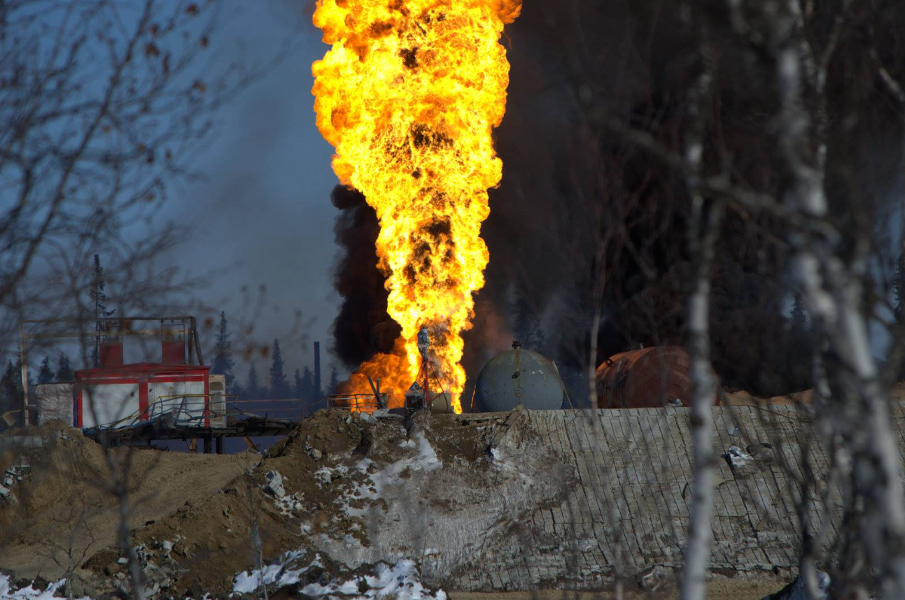 Пожар на нефтяном месторождении им. Алабушина в Усинском районе Коми, май 2017 года. Фото: Facebook[…] Сыну лесов предложили помочь своими познаниями истребить эти леса, помутить прозрачные реки, обогатить капиталистов и искателей приключений!».