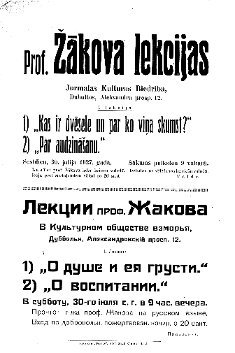 Убийство Столыпина в 1911 году отменило планы по переселению латышей в Коми. А в 1917 году уже сам Жаков переехал в Лифляндию. Его увезла туда молодая студентка Алида Приеде, ставшая его третьей женой. Но отец, ровесник Жакова, не одобрил их брак. Последовал период скитаний: Псков, Тарту и, наконец, Рига.