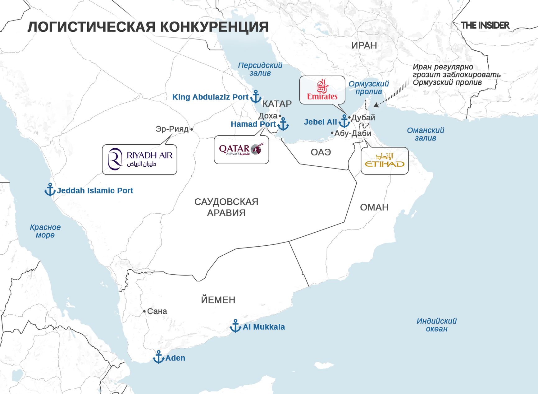 Саудовская Аравия в рамках Vision 2030 пытается перехватить часть транзита через создание Riyadh Air и развитие аэропортовой инфраструктуры в Эр-Рияде. На море ОАЭ опираются на порт Джабаль-Али (Jebel Ali) и глобального оператора DP World. Саудовская Аравия — на систему портов Красного моря и Персидского залива, включая Исламский порт Джидды (Jeddah Islamic Port) и порт короля Абдул-Азиза (King Abdulaziz Port) в Даммаме. Катар — на порт Хамад (Hamad Port), построенный и расширенный после кризиса 2017 года, когда соседние страны дружно блокировали катарцев.