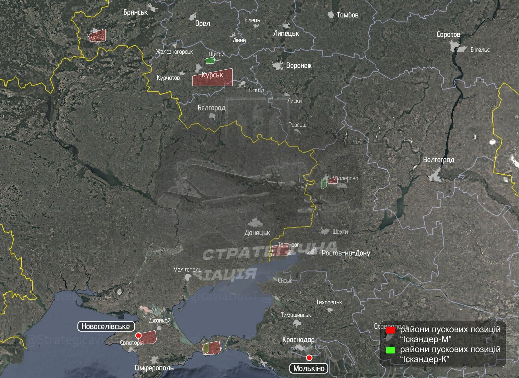 Telegram-канал «✈️Стратегічна авіація рф» выявил вероятные точки запуска баллистических ракет «Искандер-М» (шесть точек) и крылатых ракет «Искандер-К» (три точки) в Курской, Брянской, Ростовской областях и в оккупированном Крыму — всего не менее девяти локаций. Чаще всего пуски баллистических ракет совершаются из сёл в Курской области (Шумаково, Черёмушки), где ранее дислоцировались установки 9П78-1 и фиксировались последствия ударов украинских дронов, а также Крыма (Новосёловское), где «Искандеры» размещаются под открытым небом. Из города Щигры в Курской области, по имеющимся данным, запускаются преимущественно ракеты «Искандер-К». Дополнительно пуски ракет могут производиться из окрестностей Таганрога и Миллерово, а также с полигона Чауда, однако точные позиции там по спутниковым снимкам не установлены. Одним из основных мест постоянной дислокации пусковых установок считается полигон Молькино в Краснодарском крае, хотя визуально зафиксировать технику там сложно из-за ангаров.