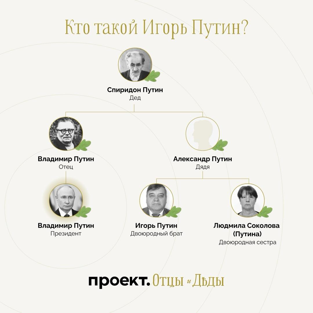 Детали. Игорь Путин — двоюродный брат Владимира Путина по «рязанской» линии, сын Александра Спиридоновича Путина — брата отца президента. До 1998 года Игорь Путин служил в армии, после выхода на пенсию пытался сделать карьеру чиновника, занимая небольшие государственные должности в Рязанской области.