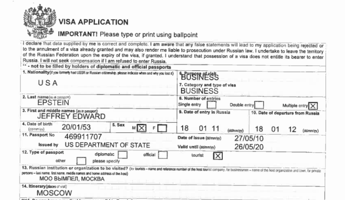 Эпштейн получил российскую визу по приглашению ветеранов ФСБ