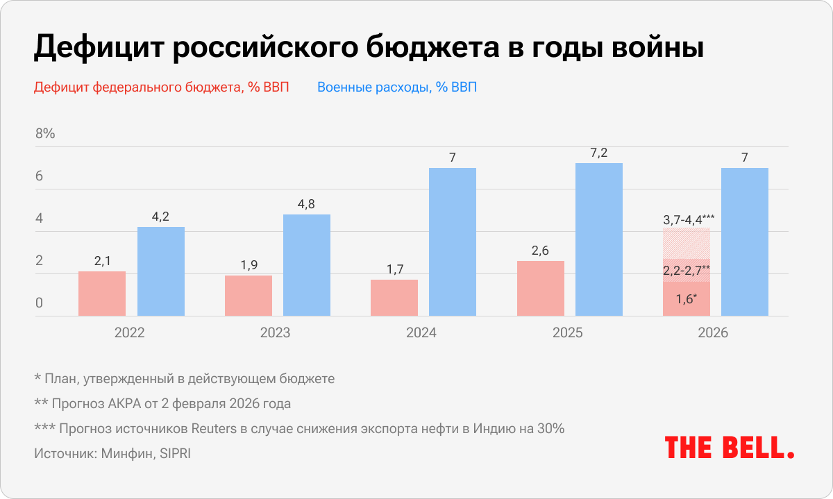 Дефицит российского бюджета по итогам 2026 года может превысить текущую цель почти втрое из-за снижения нефтегазовых доходов и роста расходов, сообщило вчера агентство Reuters. Главным образом — из-за падения закупок российской нефти Индией и роста дискаунтов на нее.