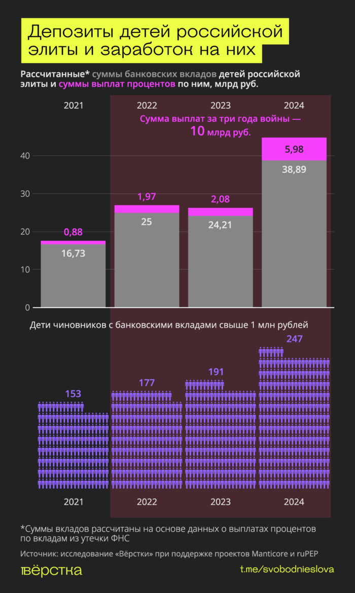 В попытках остудить экономику и сделать деньги снова «дорогими», Банк России создал финансовые возможности для сверхбогатых россиян, в том числе и для детей высших должностных лиц государства. «Вёрстка» выяснила, что с 2021 года по конец 2024 года сумма средств на их банковских вкладах выросла более чем в два раза — на 132%, а сумма выплат по вкладам более чем в шесть раз — на 578%.