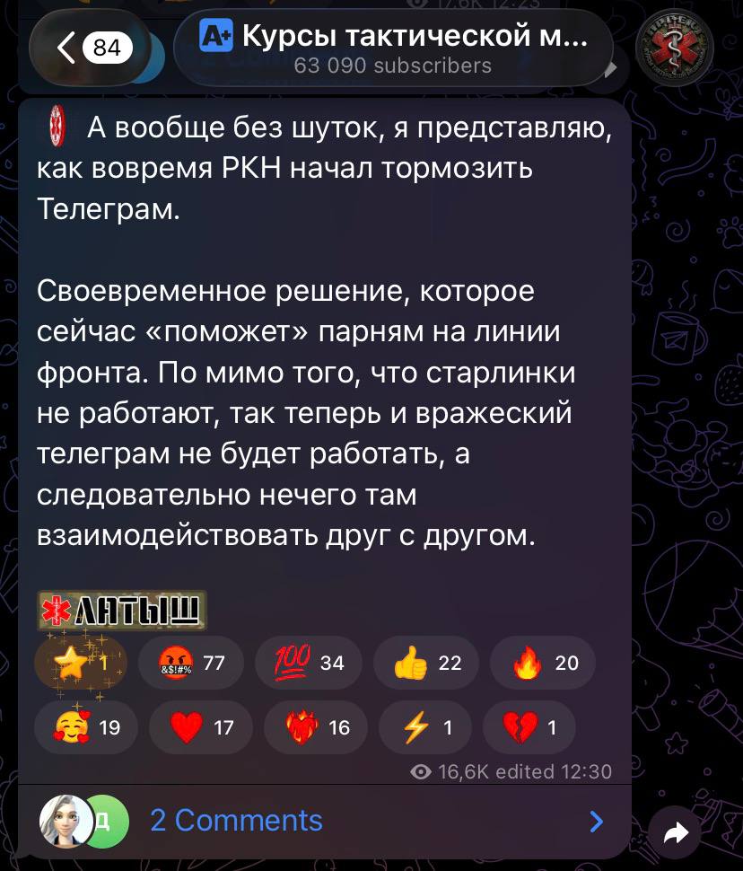 ️Провоенный канал «Курсы тактической медицины» иронично назвал блокировку «своевременным решением, которое сейчас „поможет“ парням на линии фронта». «Помимо того, что старлинки не работают, так теперь и вражеский телеграм не будет работать, а следовательно нечего там взаимодействовать друг с другом», — написали в блоге. На ухудшение положения российских военных намекнул и канал Fighterbomber. «К сожалению, мы не можем отключить хохлам „Старлинк“. Зато мы можем отключить россиянам „Телеграмм“!» — добавил он.