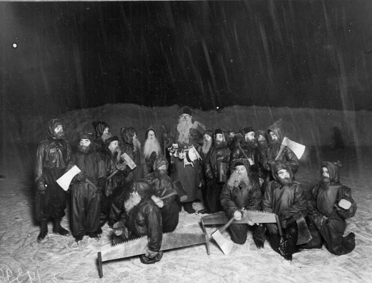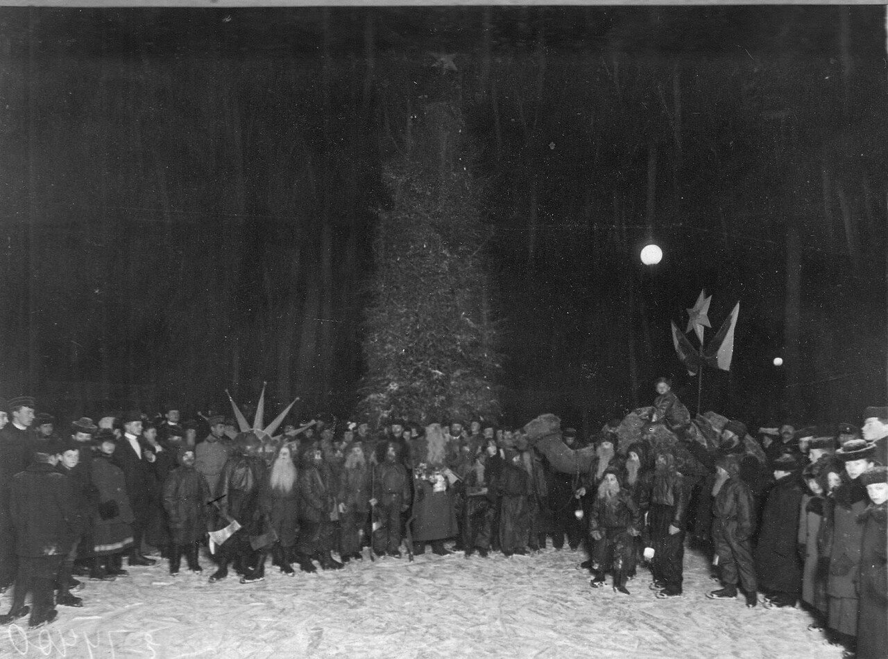 Менее очевидный мотив — маленькие бородачи с пилами (по всей видимости, такие костюмы были популярны среди детей). Это юльтомтены и юлениссе — рождественские гномы из Скандинавии. Они стали широко известны в Петербурге благодаря многотысячным тиражам открыток с их изображениями, которые печатали к праздникам шведские и немецкие издательства.