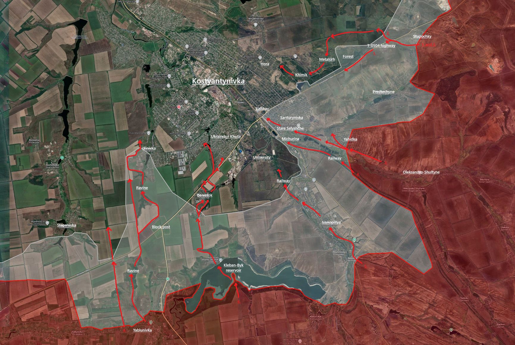 Согласно информации DeepState (1, 2), ВС РФ продвинулись в районе Бондарного, в Васюковке и Никифоровке к северо-востоку от Константиновки и в районе Степановки, к юго-западу от города. Исследователь под ником Playfra рассказывает, что российские военные под покровом тумана предприняли ряд атак на Константиновку, в ходе которых продвинулись достаточно глубоко, однако в итоге ни одна из этих атак не имела успеха, поскольку все участвовавшие в них были убиты или получили ранения.