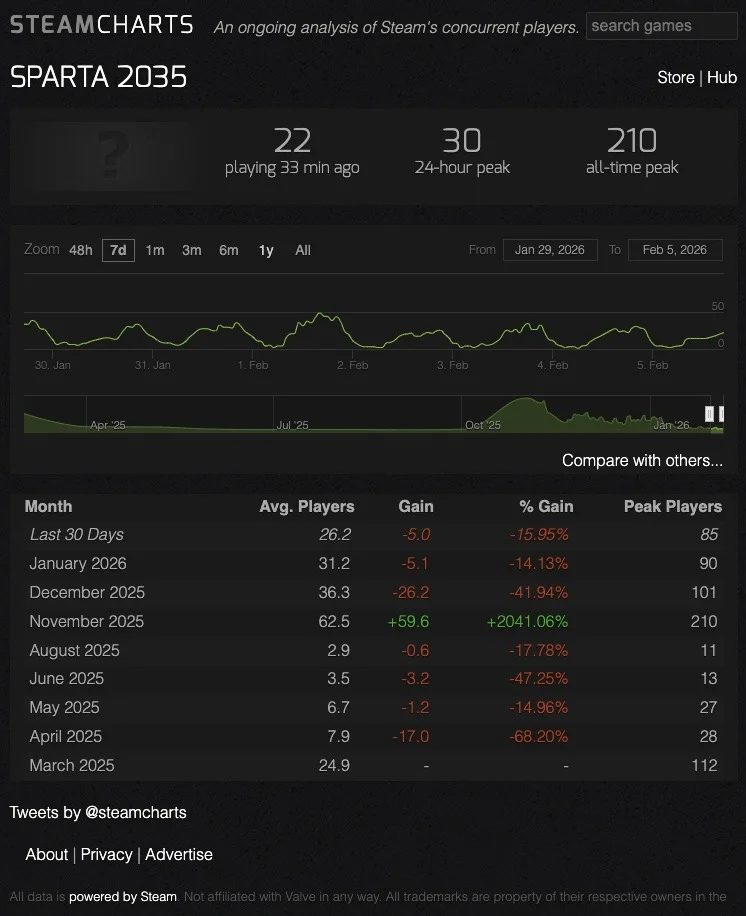 К сожалению, система VK PLay не дает опции смотреть среднее количество игроков, но другие игры из нашего списка были опубликованы на весьма демократическом Steam, где все прозрачно. Если изучить статистику игроков следующей игры, ситуация крайне плачевная. Игра «Спарта 2035» в Steam имеет пиковое значение в 210 игроков за ноябрь 2025 года. В среднем в игру заходят от 2 до 30 игроков. Не в час и даже не в день — в месяц.