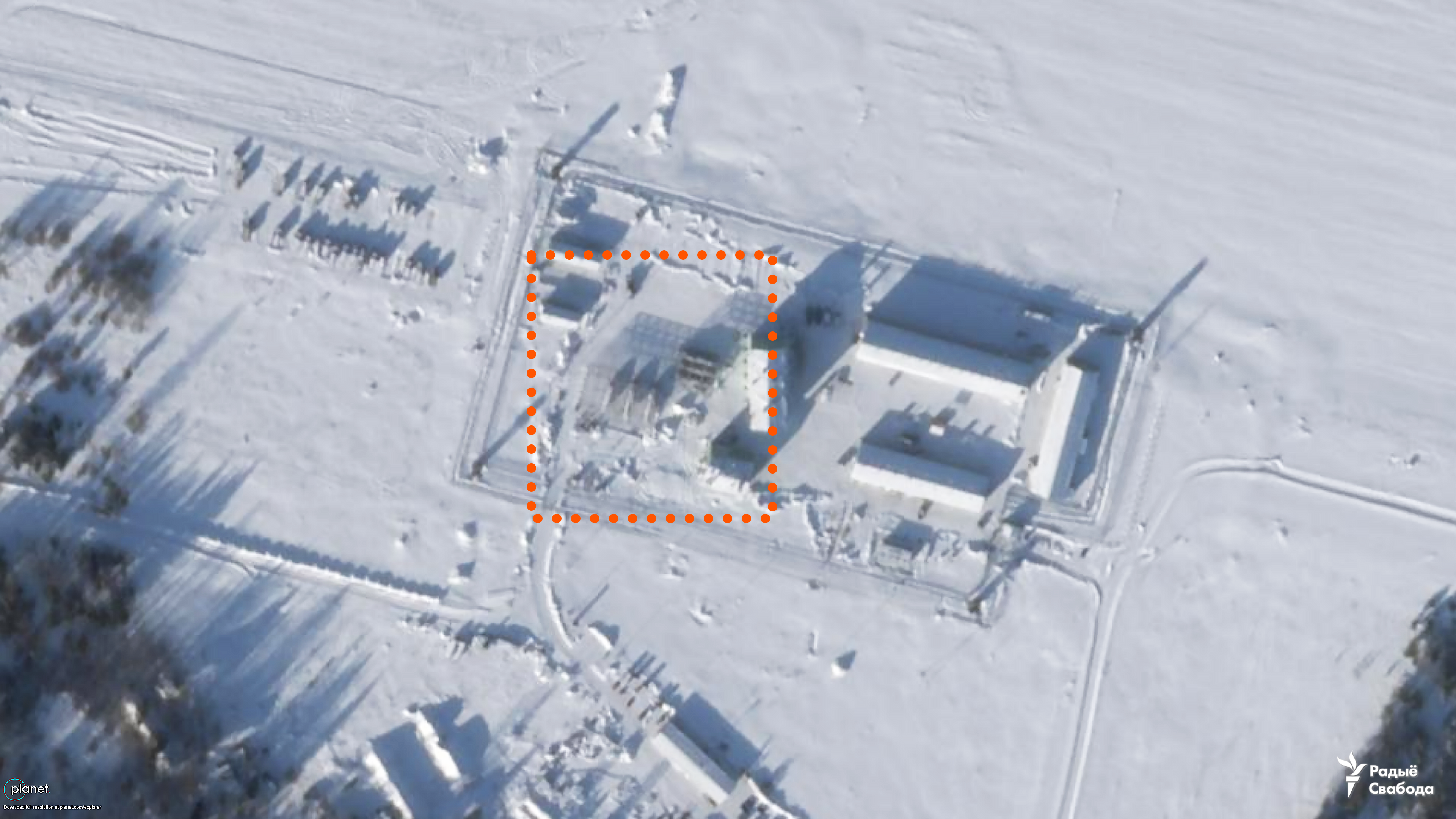 Спутниковый снимок, сделанный на этой неделе и полученный Радио Свобода, содержит детали, которые позволяют предположить, что Россия размещает ракетную систему с ядерным потенциалом "Орешник" на быстрорастущем военном объекте на территории бывшего аэродрома в соседней Беларуси.
