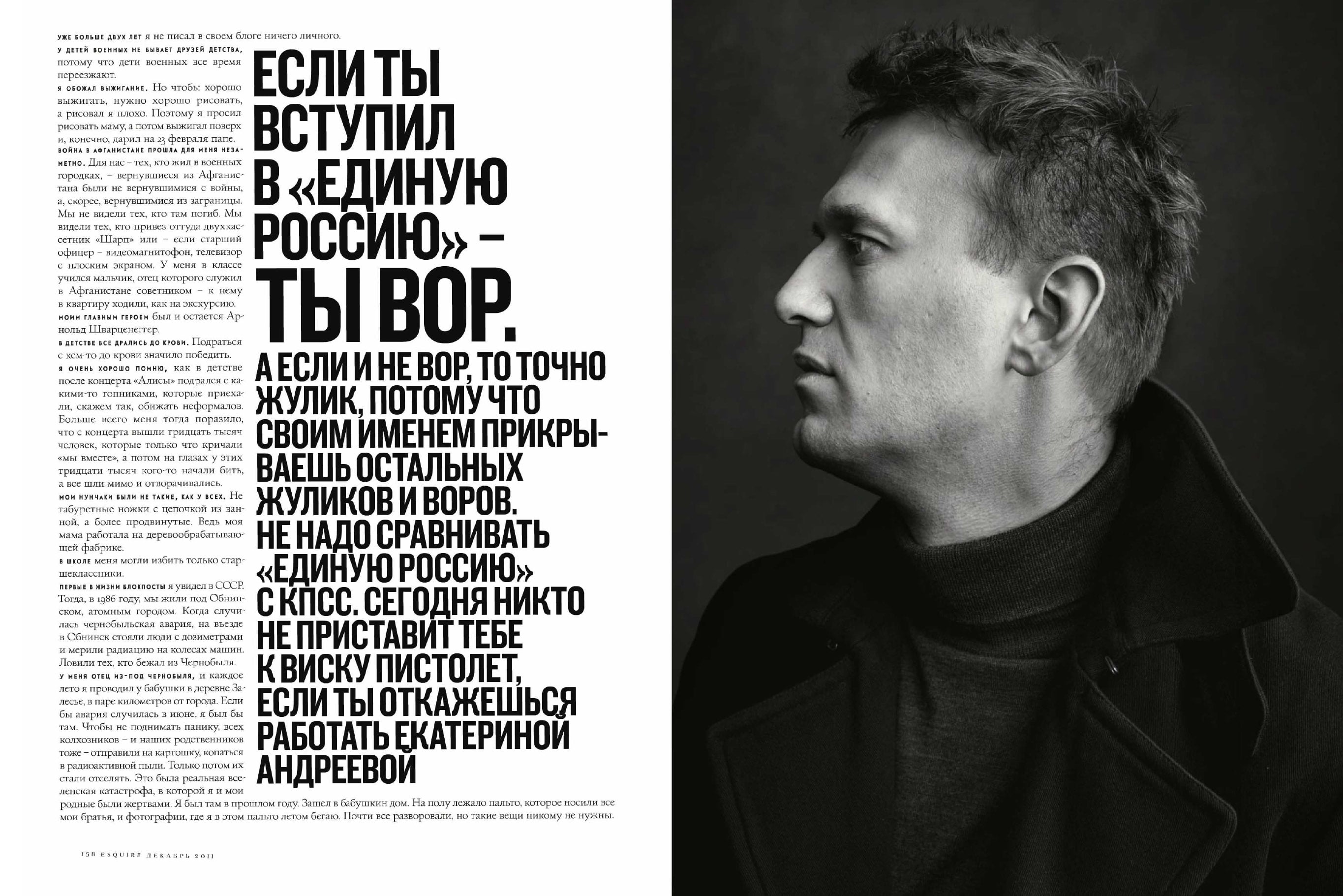 In late November 2011, a week before the State Duma elections and large-scale protests against fraud that followed, Esquire Russia published its first issue featuring a Russian on the cover. It was the 35-year-old politician Alexei Navalny, by then already well known as an anti-corruption blogger and author of the phrase “the party of crooks and thieves,” which described the ruling “United Russia” party. Inside, the magazine’s “What I’ve Learned” section featured a long interview with Navalny. As the text has since been removed from the publication’s website, Mediazona decided to bring it back to readers. We’ve shortened the English version, bringing it closer to the size of a typical “What I’ve Learned.” The original Russian version is accessible here, and the extended 2026 version, featuring previously unpublished quotes from the initial transcript, can be found here.When was Navalny’s interview deletedAccording to the Wayback Machine online archive, Alexei Navalny’s “What I’ve Learned” feature dissapeared from the official website between September 21 and 22, 2022.Left: September 21, 2022, copy of the page with Navalny’s interview still intact. Right: September 22, 2022, copy of the page with only the headline left, text and images missing. The next feature is Pablo Escobar’s “What I’ve Learned”By this point, the magazine, headed by pro-government writer and blogger Sergei Minaev, had changed its name to Pravila Zhizni (Rules of Life, the adopted a Russian name for the American “What I’ve Learned” interview format). In the spring of 2022, after the start of the full-scale invasion of Ukraine, the Hearst Corporation revoked the Russian publishers’ rights to the Esquire brand. Mediazona was unable to determine why the interview was deleted at that particular time. On September 21, 2022, Vladimir Putin announced the start of the “partial” mobilization. On the same day, the Kovrov City Court considered (and rejected) two complaints filed by Alexei Navalny against the Penal Colny No. 6 in the Vladimir region, where he was being held at the time. On September 22, Navalny was placed in solitary confinement for the second time in a row: his offense was quoting a European Court of Human Rights ruling to the guards that stated he must be released.