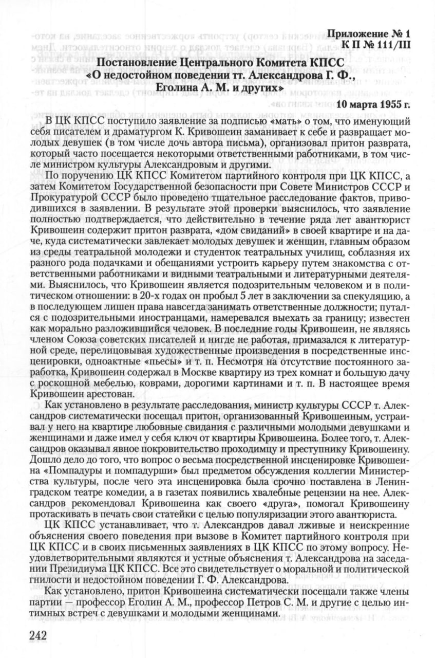 Факты подтвердились, и 10 марта 1955 года вышло Постановление Центрального Комитета КПСС «О недостойном поведении тт. Александрова Г. Ф., Еголина А. М. и других».
